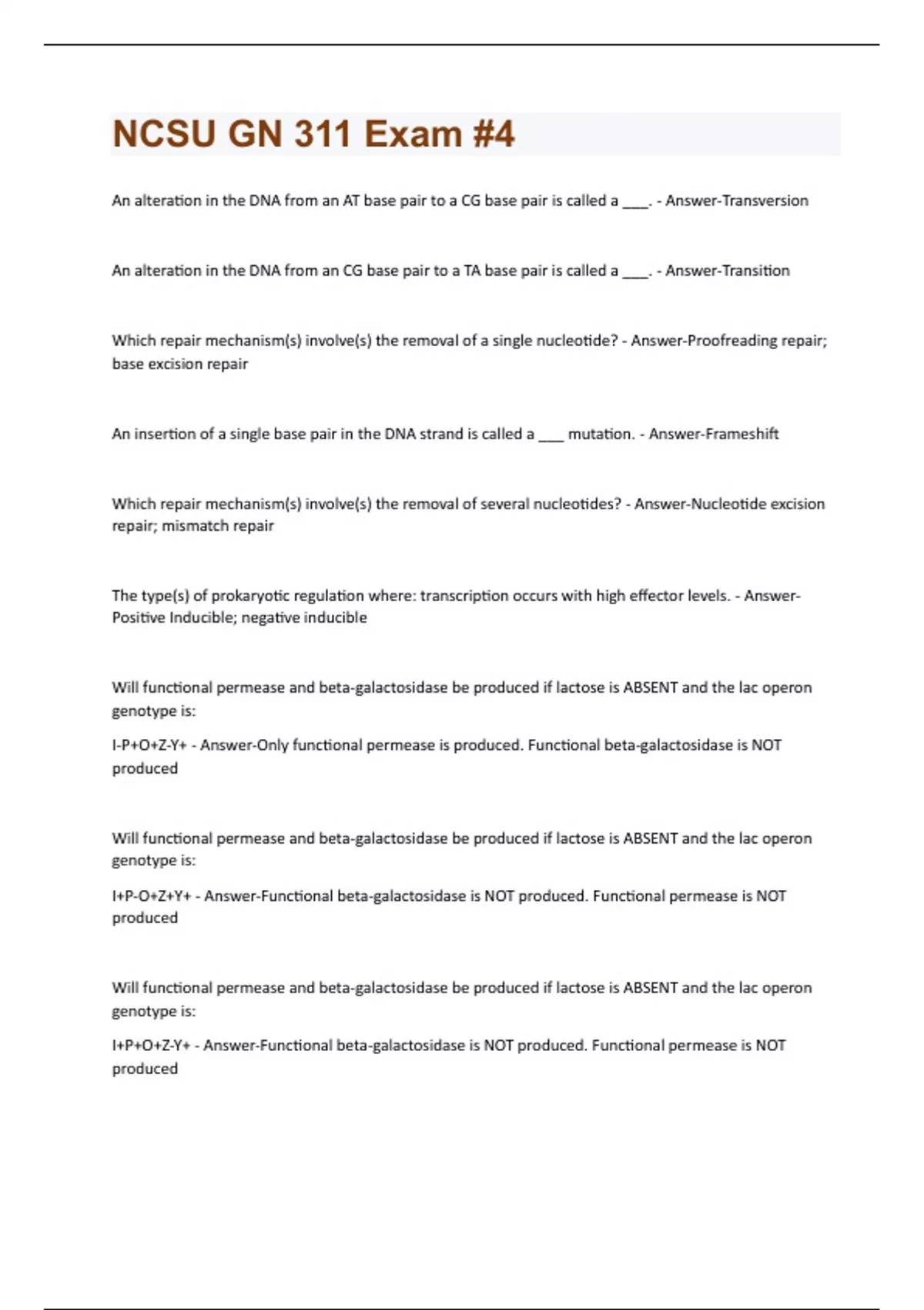 An alteration in the DNA from an AT base pair to a CG base pair is called a ___. - Answer-Transversion An alteration in the DNA from an CG base pair to a TA base pair is called a ___. - Answer-Transition Which repair mechanism(s) involve(s) the removal of a single nucleotide? - Answer-Proofreading repair; base excision repair An insertion of a single base pair in the DNA strand is called a ___ mutation. - Answer-Frameshift Which repair mechanism(s) involve(s) the removal of several nucleotides? - Answer-Nucleotide excision repair; mismatch repair The type(s) of prokaryotic regulation where: transcription occurs with high effector levels. - AnswerPositive Inducible; negative inducible Will functional permease and beta-galactosidase be produced if lactose is ABSENT and the lac operon genotype is: I-P+O+Z-Y+ - Answer-Only functional permease is produced. Functional beta-galactosidase is NOT produced Will functional permease and beta-galactosidase be produced if lactose is ABSENT and the lac operon genotype is: I+P-O+Z+Y+ - Answer-Functional beta-galactosidase is NOT produced. Functional permease is NOT produced Will functional permease and beta-galactosidase be produced if lactose is ABSENT and the lac operon genotype is: I+P+O+Z-Y+ - Answer-Functional beta-galactosidase is NOT produced. Functional permease is NOT producedWill functional permease and beta-galactosidase be produced if lactose is PRESENT and the lac operon genotype is: IsP+O+Z-Y+ - Answer-Functional beta-galactosidase is NOT produced. Functional permease is NOT produced Will functional permease and beta-galactosidase be produced if lactose is ABSENT and the lac operon genotype is: IsP-O+Z-Y-/I-P+OcZ+Y+ - Answer-Functional beta-galactosidase and functional permease are produced Will functional permease and beta-galactosidase be produced if lactose is PRESENT and the lac operon genotype is: I+P+OcZ-Y+/I-P+O+Z-Y+ - Answer-Only functional permease is produced. Functional beta-galactosidase is NOT produced Will functional permease and beta-galactosidase be produced if lactose is PRESENT and the lac operon genotype is: I+P+O+Z+Y-/IsP+OcZ+Y- - Answer-Only functional beta-galactosidase is produced. Functional permease is NOT produced Which set of terms applies to enhancers as they are associated with eukaryotic gene regulation? - Answer-Cis-acting, variable position, variable orientation Histone modifications during chromatin remodeling can include additions of ____, ____, and ____ but not ____ - Answer-Phosphate groups; methyl groups; acetyl groups; amino groups Was the significance of Alkaptonuria? - Answer-Alkaptonuria was one of the first disease phenotypes correlated with a genotype. It is characterized by absense of homogentisate oxidase activity. Scientist who conducted experiments on Alkaptonuria and diet's effect on it - Answer-Garrod Requires some chemical for growth; won't grow on minimal media because unable to synthesize a lot of necessary nutrients - Answer-AuxotrophSomatic mutations - Answer-Occur in nonreproductive cells and are passed to new cells through mitosis (some of the cells in organism affected) Germ-line mutations - Answer-Occur in reproductive cells and are passed down to half of the members of the next generation, who will carry the mutation in all of their cells Gain of function protein mutation - Answer-Cell produces protein that is not normally present; either new gene product or gene product in new location/at an inappropriate time during development Point mutation - Answer-Results in substitution of 1 base for another Transition point mutation definition; what base change to what? - Answer-Purine to purine or pyrimidine to pyrimidine change; A to G, C to T, etc. Transversion point mutation definition; what bases change to what? - Answer-Pyrimidine to purine or purine to primidine; A to C, G to T, etc. Missense (nonsynonymous) mutation and subtype neutral - Answer-A mutation that changes the amino acid (may alter protein function or protein is nonfunctional). Neutral is a missense mutation that doesn't affect protein function Nonsense mutation - Answer-A mutation that changes the codon so that it becomes a stop codon Silent (synonymous) mutation - Answer-A mutation that still codes for the same amino acid