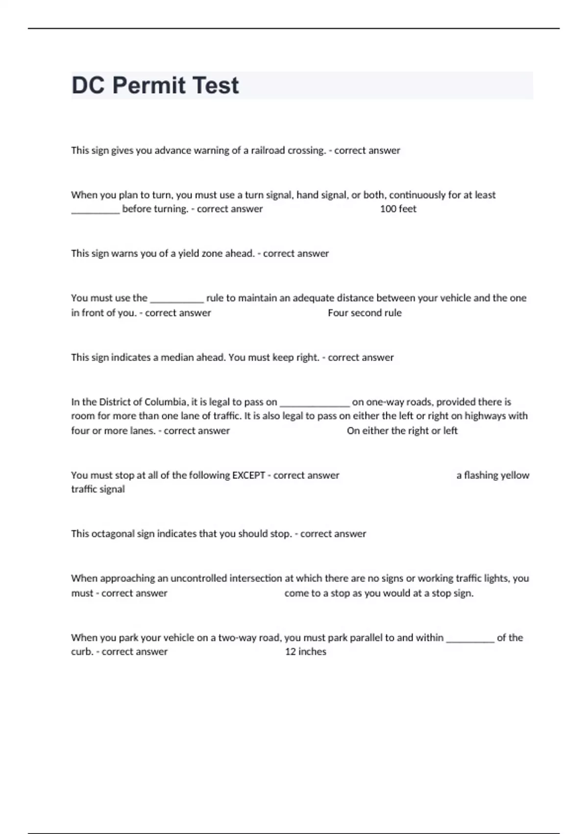 This sign gives you advance warning of a railroad crossing. - correct answer When you plan to turn, you must use a turn signal, hand signal, or both, continuously for at least _________ before turning. - correct answer 100 feet This sign warns you of a yield zone ahead. - correct answer You must use the __________ rule to maintain an adequate distance between your vehicle and the one in front of you. - correct answer Four second rule This sign indicates a median ahead. You must keep right. - correct answer In the District of Columbia, it is legal to pass on _____________ on one-way roads, provided there is room for more than one lane of traffic. It is also legal to pass on either the left or right on highways with four or more lanes. - correct answer On either the right or left You must stop at all of the following EXCEPT - correct answer a flashing yellow traffic signal This octagonal sign indicates that you should stop. - correct answer When approaching an uncontrolled intersection at which there are no signs or working traffic lights, you must - correct answer come to a stop as you would at a stop sign. When you park your vehicle on a two-way road, you must park parallel to and within _________ of the curb. - correct answer 12 inches If an emergency vehicle with flashing red lights or a siren is approaching in your lane, you are required to - correct answer pullover to the curb and stop. On a road with two or more lanes traveling in the same direction, you must stay in the _________ except to pass. - correct answer right lane The blind spots around a truck are called - correct answer No-Zones A vehicle's tires riding on a layer of water on the road is known as - correct answer hydroplaning When driving, you must have your headlights on - correct answer from 30 minutes after sunset to 30 minutes before sunrise Which of the following is the correct hand signal for a left turn? - correct answer The left hand pointing straight out. Yellow pavement markings on the road indicate - correct answer the left edge of the roadway This sign indicates a steep hill ahead. - correct answer This pentagonal sign indicates a school-zone ahead and marks school crossings. - correct answer When you decide to leave an interstate, you must get into - correct answer a deceleration lane If you miss your exit on an interstate, you must - correct answer continue to the next exit, where you can leave and re-enter the highway to return to the exit you missed. District of Columbia traffic law requires that _________ wear seat belts in passenger cars, trucks, tractors, multi-purpose vehicles, or passenger buses. - correct answer all front-seat passengers, all rear-seat passengers, and all drivers When parking your vehicle on a downhill grade, you should turn your front wheels - correct answer toward the curb or the edge of the road, so that if you start to roll downhill, you will not roll out into traffic A roundabout is a circular intersection at which all traffic travels _________, always to the _______, around a central island. - correct answer counterclockwise, right If you see a vehicle coming toward you in your lane, you should - correct answer move to the right, slow down, sound your horn, and flash your headlights. Do not move into the lane the vehicle has left. This sign indicates that a telephone service is available near the sign - correct answer If someone is following you too closely, you should - correct answer slow down and encourage the driver to pass Before passing another vehicle, you should - correct answer look ahead for road conditions and traffic True or false: Always make a U-turn at a location that is marked with a no U-turn sign - correct answer False If the traffic signals at an intersection are not operating properly, treat the intersection as a(n) - correct answer all-way stop If your vehicle's wheels drift onto the shoulder of the road, you should - correct answer not try to turn back onto the pavement right away While you are passing, if it appears that you will not have time to complete the pass before meeting oncoming traffic, - correct answer slow down and return to the lane behind the vehicle you were passing Before changing lanes, you should - correct answer you should check your mirrors and then check your blind spot by looking over your shoulder toward the rear. A type of parking commonly found in parking lots, shopping centers, and on wide streets? - correct answer angle parking True or false: at an intersection where there is no stop sign, no yield sign, or oncoming traffic signal, drivers must yield to vehicles coming from the left. - correct answer False If a tire blows out, you should NOT - correct answer brake immediately. Hold the steering wheel tightly, steer straight ahead, and slowly ease your foot off the accelerator. Do not brake until the vehicle is back under your control. Pull the vehicle completely off the road at the nearest safe location. On a road with three or more lanes traveling in the same direction, the leftmost lane is intended for - correct answer passing slower vehicles If you spot a slow-moving vehicle in your lane, you should - correct answer slow down safely. If you have time, change your lane. Diagonal yellow stripes painted on some streets and highways indicate - correct answer either a narrow road or an obstruction ahead A __________ offers you the best possible protection in a car crash and is therefore your best defense against a drunk driver. - correct answer seat-belt To guard against glare from the headlights of a vehicle behind you, you must use __________ and adjust it before you drive - correct answer a day/night mirror To ente