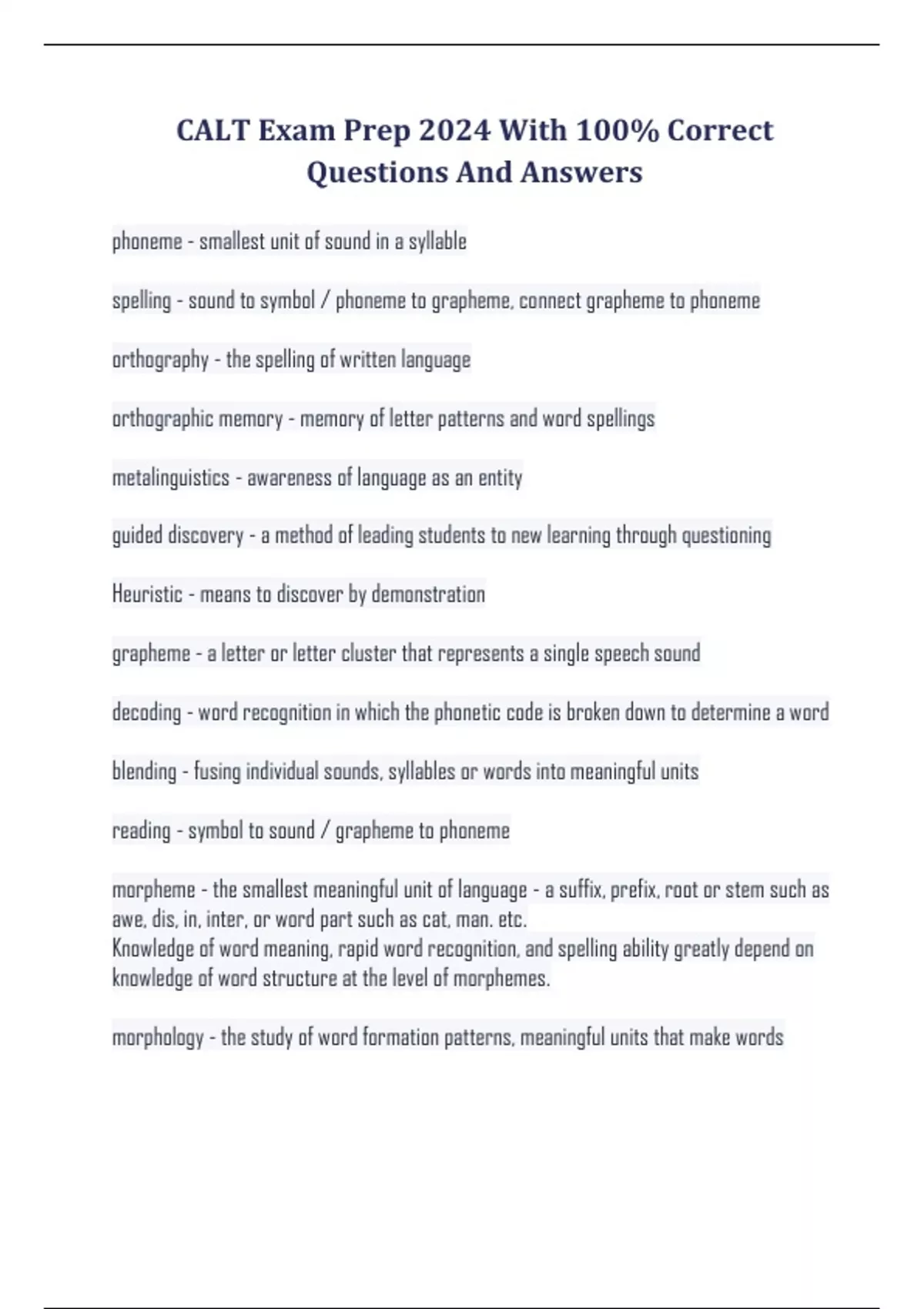 CALT Exam Prep 2024 With 100% Correct Questions And Answers phoneme - smallest unit of sound in a syllable spelling - sound to symbol / phoneme to grapheme, connect grapheme to phoneme orthography - the spelling of written language orthographic memory - memory of letter patterns and word spellings metalinguistics - awareness of language as an entity guided discovery - a method of leading students to new learning through questioning Heuristic - means to discover by demonstration grapheme - a letter or letter cluster that represents a single speech sound decoding - word recognition in which the phonetic code is broken down to determine a word blending - fusing individual sounds, syllables or words into meaningful units reading - symbol to sound / grapheme to phoneme morpheme - the smallest meaningful unit of language - a suffix, prefix, root or stem such as awe, dis, in, inter, or word part such as cat, man. etc. Knowledge of word meaning, rapid word recognition, and spelling ability greatly depend on knowledge of word structure at the level of morphemes. morphology - the study of word formation patterns, meaningful units that make words fricative - a sound produced by forcing air through a narrow opening between the teeth or lips / f / / sh / / z /
