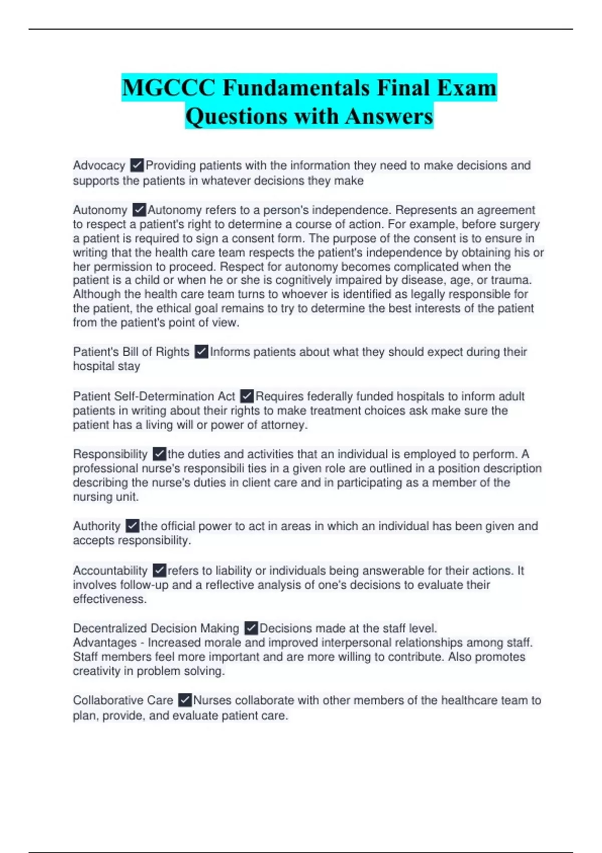 Advocacy Providing patients with the information they need to make decisions and supports the patients in whatever decisions they make Autonomy Autonomy refers to a person's independence. Represents an agreement to respect a patient's right to determine a course of action. For example, before surgery a patient is required to sign a consent form. The purpose of the consent is to ensure in writing that the health care team respects the patient's independence by obtaining his or her permission to proceed. Respect for autonomy becomes complicated when the patient is a child or when he or she is cognitively impaired by disease, age, or trauma. Although the health care team turns to whoever is identified as legally responsible for the patient, the ethical goal remains to try to determine the best interests of the patient from the patient's point of view. Patient's Bill of Rights Informs patients about what they should expect during their hospital stay Patient Self-Determination Act Requires federally funded hospitals to inform adult patients in writing about their rights to make treatment choices ask make sure the patient has a living will or power of attorney. Responsibility the duties and activities that an individual is employed to perform. A professional nurse's responsibili ties in a given role are outlined in a position description describing the nurse's duties in client care and in participating as a member of the nursing unit. Authority the official power to act in areas in which an individual has been given and accepts responsibility. Accountability refers to liability or individuals being answerable for their actions. It involves follow-up and a reflective analysis of one's decisions to evaluate their effectiveness. Decentralized Decision Making Decisions made at the staff level. Advantages - Increased morale and improved interpersonal relationships among staff. Staff members feel more important and are more willing to contribute. Also promotes creativity in problem solving. Collaborative Care Nurses collaborate with other members of the healthcare team to plan, provide, and evaluate patient care. The primary goal of each member of the healthcare team is to promote and restore health. Example: Nurse consults with the dietitian for a patient who is not eating well or who needs to lose weight. Physicians primarily responsible for the diagnosis of illness and the medical or surgical tx of that illness Nurse Practicioner/Physicians's Assistant responsibilities usually depend on the supervising physician and might include conducting physical examinations and rounding on patients.
