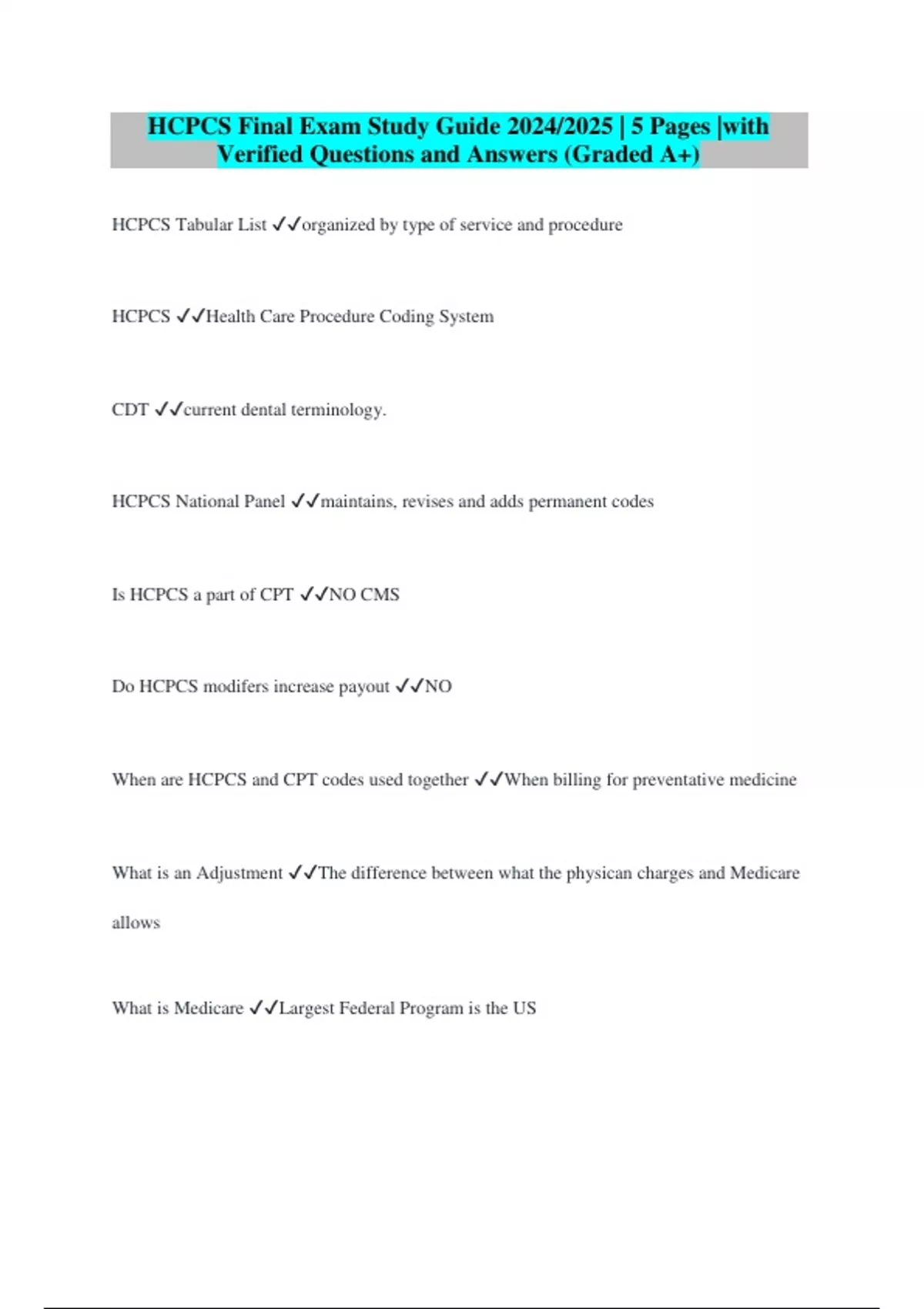 HCPCS Final Exam Study Guide 2024/2025 | 5 Pages |with Verified Questions and Answers (Graded A+)