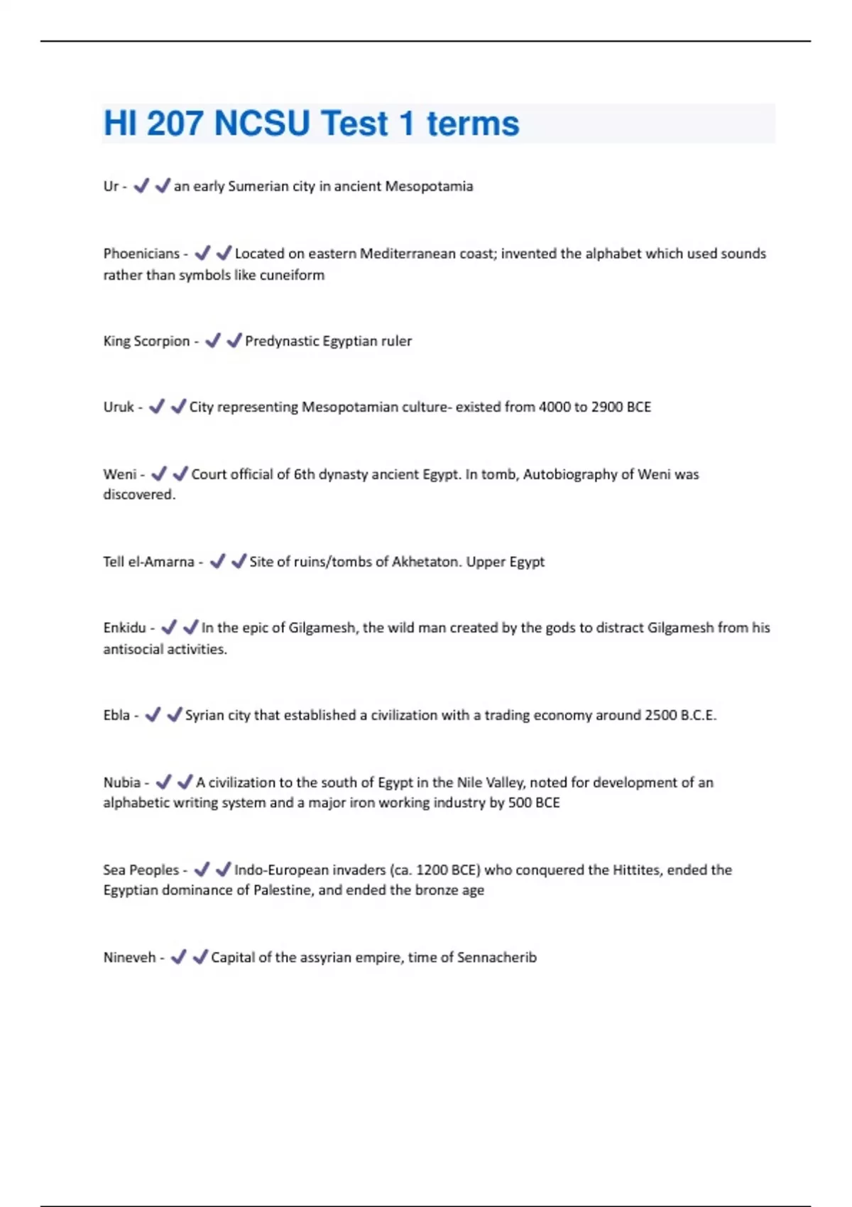 Ur - an early Sumerian city in ancient Mesopotamia Phoenicians - Located on eastern Mediterranean coast; invented the alphabet which used sounds rather than symbols like cuneiform King Scorpion - Predynastic Egyptian ruler Uruk - City representing Mesopotamian culture- existed from 4000 to 2900 BCE Weni - Court official of 6th dynasty ancient Egypt. In tomb, Autobiography of Weni was discovered. Tell el-Amarna - Site of ruins/tombs of Akhetaton. Upper Egypt Enkidu - In the epic of Gilgamesh, the wild man created by the gods to distract Gilgamesh from his antisocial activities. Ebla - Syrian city that established a civilization with a trading economy around 2500 B.C.E. Nubia - A civilization to the south of Egypt in the Nile Valley, noted for development of an alphabetic writing system and a major iron working industry by 500 BCE Sea Peoples - Indo-European invaders (ca. 1200 BCE) who conquered the Hittites, ended the Egyptian dominance of Palestine, and ended the bronze age Nineveh - Capital of the assyrian empire, time of SennacheribIsraelites - What Hebrews were called after Moses received the ten commandments Narmer palette - An artifact discovered at the site of Hierakonpolis; its two sides show the unification of Upper and Lower Egypt under King Narmer Linear B - Mycenaean written script, adapted from the Minoan Linear A. Sennacherib - Kind of Assyria 704-681 BCE Thera - Island in Aegean Sea, site of Minoan colony Akhenaton - Egyptian pharaoh of the New Kingdom; attempted to establish a one-god religion, replacing the traditional Egyptian pantheon of gods. BCE Utnapishtim - Epic of Gilgamesh- Survivor of a flood sent by the gods to destroy humanity; the gods granted him eternal life. Amorites - A group of semitic people who overwhelmed the Mesopotamians and founded the Babylonian Empire, 2000 BCE Eridu - Considered the oldest known city in the world. located in southern Mesopotamia, was inhabited by sumerians Thutmose III - A pharaoh during the Middle Kingdom that was one of the greatest conquerers and many new lands were brought under control under his reign. BCE Cyrus - Founder of the Achaemenid Persian Empire. Between 550 and 530 B.C.E. he conquered Media, Lydia, and Babylon. Revered in the traditions of both Iran and the subject peoples. King of Persia. Solomon - The Hebrew king who built Jerusalem's first Hebrew temple; son of King David. 970-930 BCEAbydos - One of the most ancient cities of Upper Egypt. According to Egyptian Mythology-the holy city where Osiris was buried, in addition to many other pharaohs Hyksos - Semitic people who invaded Egypt in 1730 BCE, beginning the second Intermediate period during which the Hyksos (meaning "foreigner) ruled as pharaohs in Lower Egypt and exacted tribute from the royal families in Thebes. Hittites - An ancient Anatolian group whose empire at largest extent consisted of most of the Middle East. Some of the first two-wheeled chariots and iron. Settles Anatolia 2000 BCE Philistines - A powerful nation that invaded Canaan from the sea and became the most hated enemies of Israel. Descended from Pelset ppl in Palestine Jericho - Palestinian city dating back 9000 BCE, destroyed by Israelites in bible Troy - city in northwest Anatonia, destroyed by mycenaeans Kassites - into European people who invaded Mesopotamia in 1500 BCE Natufians - hunter-gatherer peoples of Syria and Palestine, BCE Uruk Vase - Vase found in temple of Sumerian goddess Inanna
