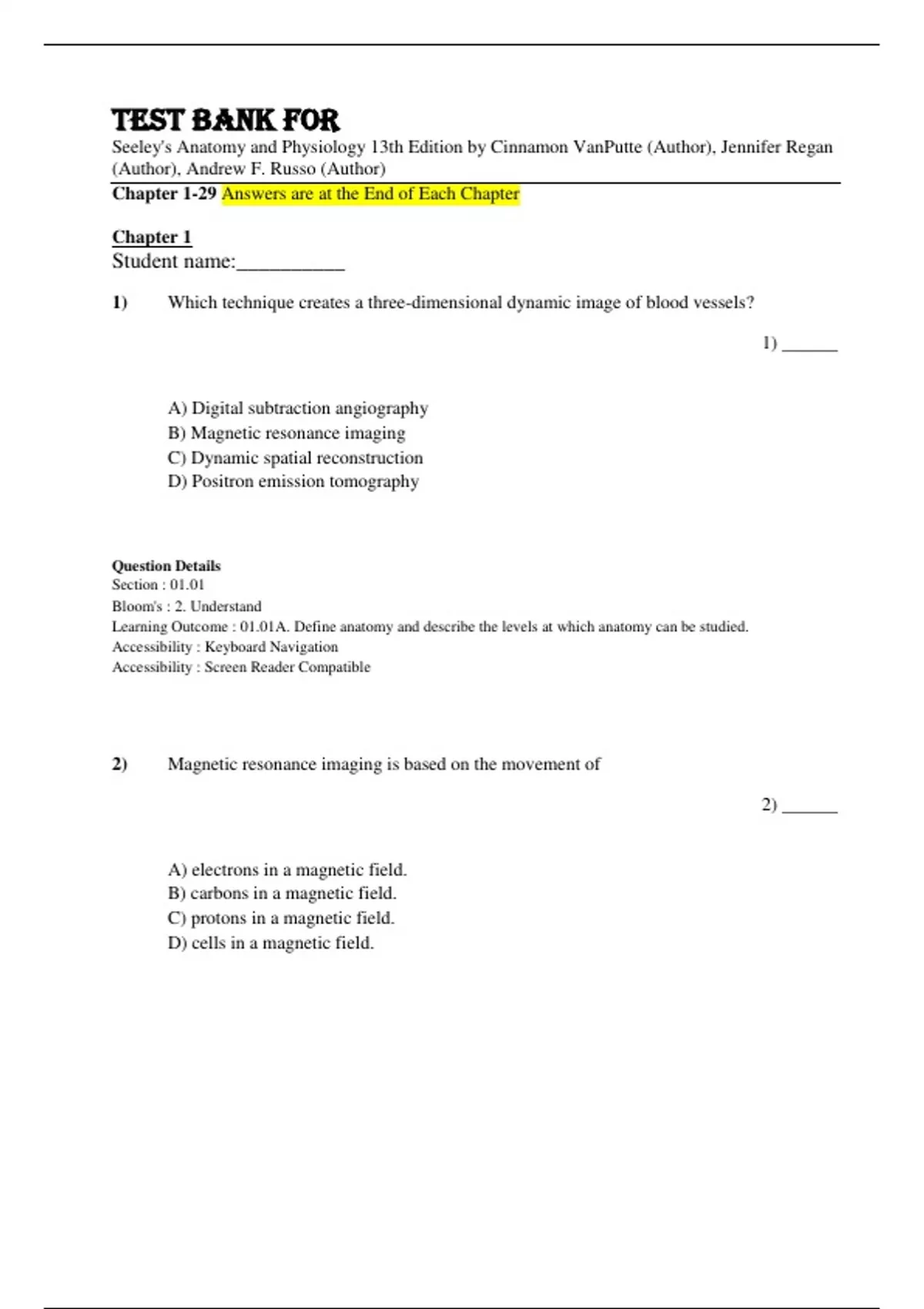 1) ______ A) Digital subtraction angiography B) Magnetic resonance imaging C) Dynamic spatial reconstruction D) Positron emission tomography Question Details Section : 01.01 Bloom's : 2. Understand Learning Outcome : 01.01A. Define anatomy and describe the levels at which anatomy can be stu died. Accessibility : Keyboard Navigation Accessibility : Screen Reader Compatible 2) Magnetic resonance imaging is based on the movement of