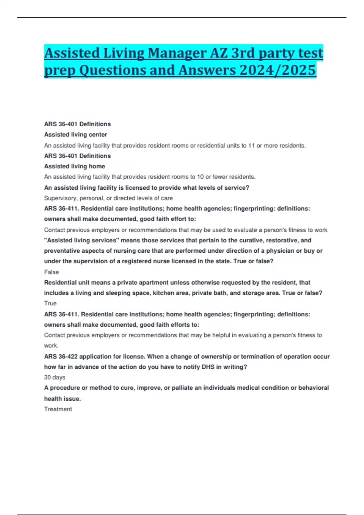 Assisted Living Manager AZ 3rd party test prep Questions and Answers 2024/2025