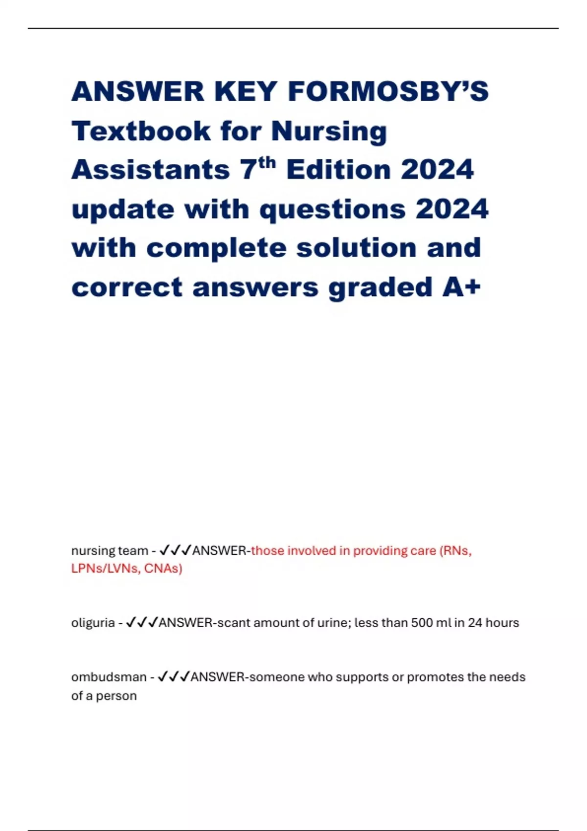 ANSWER KEY FORMOSBY’S Textbook for Nursing Assistants 7th Edition 2024 update with questions 2024 with complete solution and correct answers graded A+