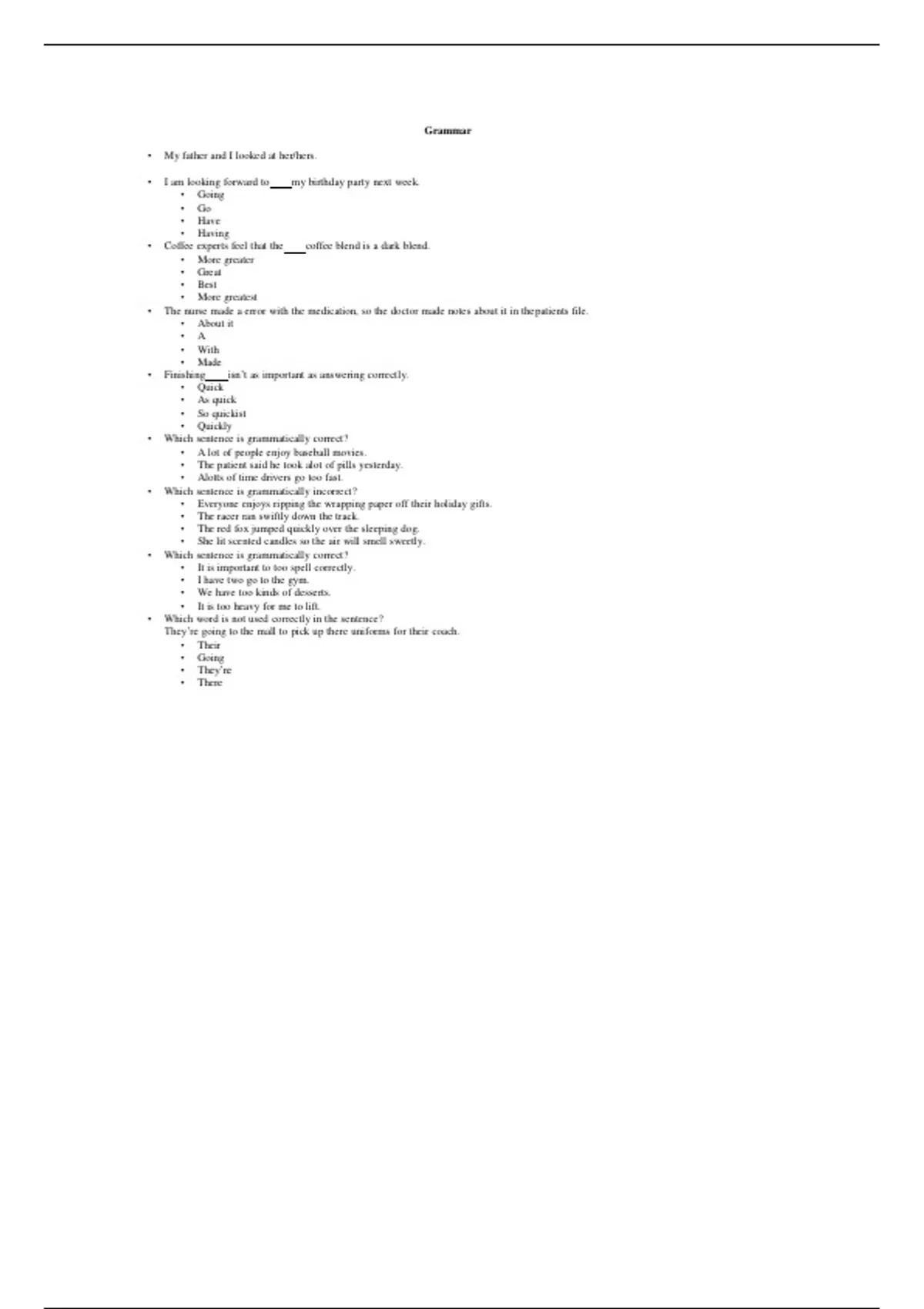 Grammar • My father and I looked at her/hers. • I am looking forward to my birthday party next week. • Going • Go • Have • Having • Coffee experts feel that the coffee blend is a dark blend. • More greater • Great • Best • More greatest • The nurse made a error with the medication, so the doctor made notes about it in thepatients file. • About it • A • With • Made • Finishing isn’t as important as answering correctly. • Quick • As quick • So quickist • Quickly • Which sentence is grammatically correct? • A lot of people enjoy baseball movies. • The patient said he took alot of pills yesterday. • Alotts of time drivers go too fast. • Which sentence is grammatically incorrect? • Everyone enjoys ripping the wrapping paper off their holiday gifts. • The racer ran swiftly down the track. • The red fox jumped quickly over the sleeping dog. • She lit scented candles so the air will smell sweetly. • Which sentence is grammatically correct? • It is important to too spell correctly. • I have two go to the gym. • We have too kinds of desserts. • It is too heavy for me to lift. • Which word is not used correctly in the sentence? They’re going to the mall to pick up there uniforms for their coach. • Their • Going • They’re • There • After throwing their sleeping bags into the backseat of their car, they more than 400miles to reach their destination. • Driving • Having driven • Drove • Had drove • Place the four words in alphabetical order. • Assemble, assembled, assembling, assembly • Assembly, assemble, assembled, assembling • Assemble, assembly, assembling, assembled • Assemble, assembly, assembled, assembling • The shopper was angry when he realized he it cheaper at the other store. • Get • Could have got • Could have gotten • Might have get • Which sentence is not grammatically correct? • Because he did not examine the patient, the healthcare provider prescribed herwith the wrong medication. • The nurse decided to bathe the client, than trim his nails. • The dietician, through negligence, made a mistake with the diet plan. • Since the child was feeling ill, the nurse sent him home