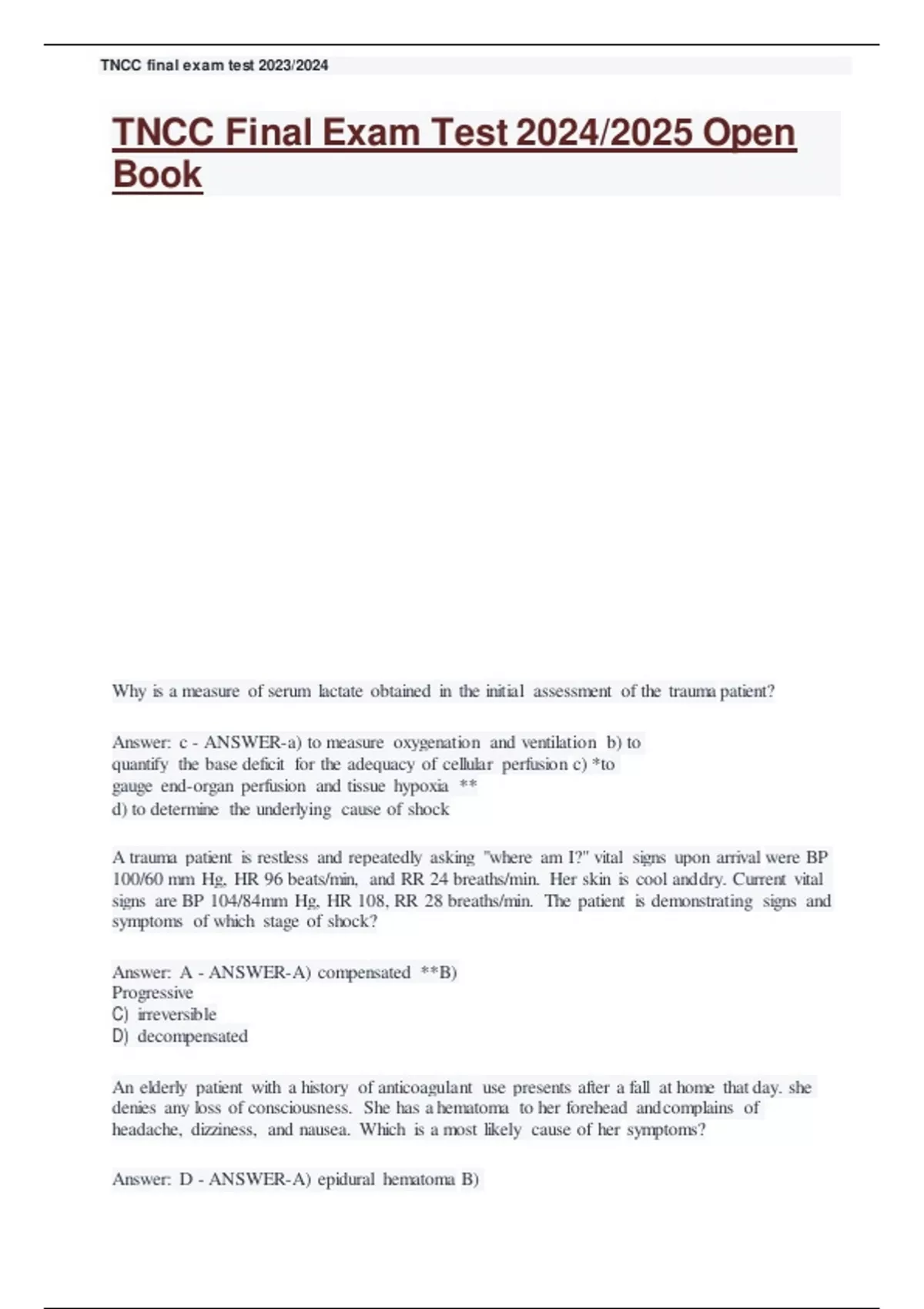 Why is a measure of serum lactate obtained in the initial assessment of the trauma patient? Answer: c - ANSWER-a) to measure oxygenation and ventilation b) to quantify the base deficit for the adequacy of cellular perfusion c) *to gauge end-organ perfusion and tissue hypoxia ** d) to determine the underlying cause of shock A trauma patient is restless and repeatedly asking "where am I?" vital signs upon arrival were BP 100/60 mm Hg, HR 96 beats/min, and RR 24 breaths/min. Her skin is cool anddry. Current vital signs are BP 104/84mm Hg, HR 108, RR 28 breaths/min. The patient is demonstrating signs and symptoms of which stage of shock? Answer: A - ANSWER-A) compensated **B) Progressive C) irreversible D) decompensated An elderly patient with a history of anticoagulant use presents after a fall at home that day. she denies any loss of consciousness. She has a hematoma to her forehead andcomplains of headache, dizziness, and nausea. Which is a most likely cause of her symptoms? Answer: D - ANSWER-A) epidural hematoma B) TNCC Final Exam Test 2024/2025 Open Book TNCC final exam test 2023/2024 diffuse axonal injury C) post-concussive syndrome D) subdural hematoma *** EMS brings a patient who fell riding his bicycle. Using the American College of Surgeons screening guidelines, which assessment finding would prompt the nurse toprepare the patient for radiologic spine clearance? Answer: D - ANSWER-A) Alert with no neurologic deficits B) Multiple abrasions to the extremities C) Multiple requests of water D) Smell of alcohol on breath *** Which of the followin