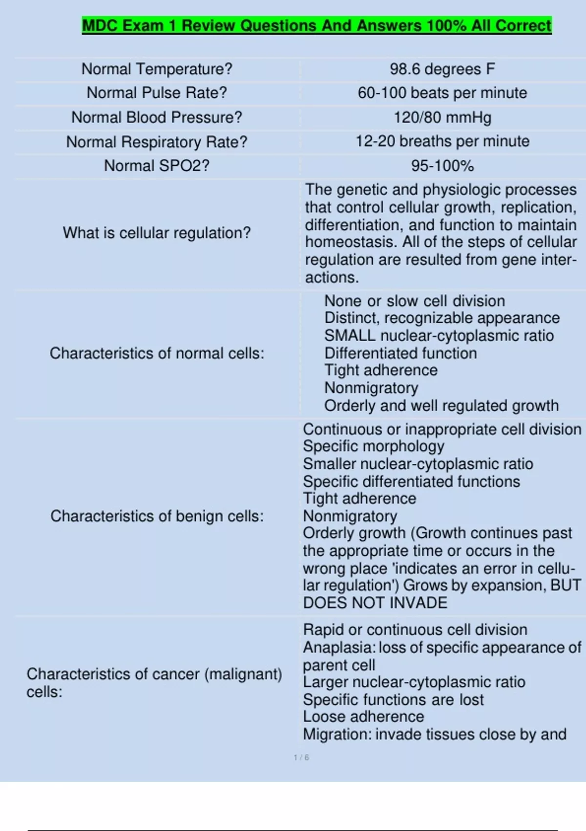 Normal Temperature? Normal Pulse Rate? Normal Blood Pressure? Normal Respiratory Rate? Normal SPO2? What is cellular regulation? Characteristics of normal cells: Characteristics of benign cells: Characteristics of cancer (malignant) cells: 98.6 degrees F 60-100 beats per minute 120/80 mmHg 12-20 breaths per minute 95-100% The genetic and physiologic processes that control cellular growth, replication, differentiation, and function to maintain homeostasis. All of the steps of cellular regulation are resulted from gene inter￾actions. None or slow cell division Distinct, recognizable appearance SMALL nuclear-cytoplasmic ratio Differentiated function Tight adherence Nonmigratory Orderly and well regulated growth Continuous or inappropriate cell division Specific morphology Smaller nuclear-cytoplasmic ratio Specific differentiated functions Tight adherence Nonmigratory Orderly growth (Growth continues past the appropriate time or occurs in the wrong place 'indicates an error in cellu￾lar regulation') Grows by expansion, BUT DOES NOT INVADE Rapid or continuous cell division Anaplasia: loss of specific appearance of parent cell Larger nuclear-cytoplasmic ratio Specific functions are lost Loose adherence Migration: invade tissues close by and MDC Exam 1 Review Questions And Answers 100% All Correct 2 / 6 What is metastasis? T or F? Even though the tumor is now in another organ, it is still cancer from the original altered tissue. What is a primary tumor? What is a secondary tumor? What is the TNM system? T or F? Cancer cells that barely resemble the mature tissue from which they arose that are aggressive and spread rapidly are "high-grade" tumors. What is low-grade cancer? Why is tumor grading needed? What are external factors that cause cancer? more remote from origin Abnormal chromosomes When cancer cells move from the primary location by breaking off from the original group and establishing remote colonies. True original group of cancer cells or tumor caused by carcinogenesis Cancerous tumor cells that move from the primary location by breaking off from the original group and establishing remote colonies. The Tissue, Node, Metastasis system **Not useful for leukemia or lymphomas** True; poor differentiation less malignant cells that are "well differentiated" and more closely resemble the tissue from which they arose. some cancers are "more malignant" than others varying in their aggressiveness and sensitivity to treatment. Environmental carcinogens: Chemical, Physical, and Viral -Chemical: everyday chemicals and drugs (tobacco) -Physical: radiation and chronic irritation and tissue trauma (Skin cancer higher in adults with burn scars or other severe skin injuries)