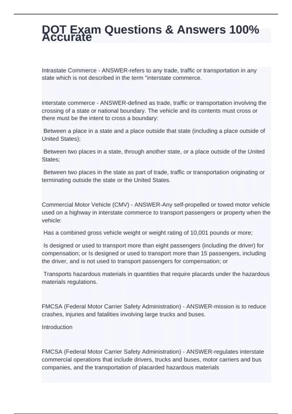 Intrastate Commerce - ANSWER-refers to any trade, traffic or transportation in any state which is not described in the term "interstate commerce. interstate commerce - ANSWER-defined as trade, traffic or transportation involving the crossing of a state or national boundary. The vehicle and its contents must cross or there must be the intent to cross a boundary: Between a place in a state and a place outside that state (including a place outside of United States); Between two places in a state, through another state, or a place outside of the United States; Between two places in the state as part of trade, traffic or transportation originating or terminating outside the state or the United States. Commercial Motor Vehicle (CMV) - ANSWER-Any self-propelled or towed motor vehicle used on a highway in interstate commerce to transport passengers or property when the vehicle: Has a combined gross vehicle weight or weight rating of 10,001 pounds or more; Is designed or used to transport more than eight passengers (including the driver) for compensation; or Is designed or used to transport more than 15 passengers, including the driver, and is not used to transport passengers for compensation; or Transports hazardous materials in quantities that require placards under the hazardous materials regulations. FMCSA (Federal Motor Carrier Safety Administration) - ANSWER-mission is to reduce crashes, injuries and fatalities involving large trucks and buses. Introduction FMCSA (Federal Motor Carrier Safety Administration) - ANSWER-regulates interstate commercial operations that include drivers, trucks and buses, motor carriers and bus companies, and the transportation of placarded hazardous materials FMCSA Office of Medical Programs - ANSWER-lead federal agency within the FMCSA for the regulation of CMV drivers' health and safety. Its mission is to promote the safety of America's roadways through the promulgation and implementation of medical regulations, guidelines, and policies that ensure commercial motor vehicle (CMV) drivers engaged in interstate commerce are medically qualified NRCME (National Registry of Certified Medical Examiners) - ANSWER-primary mission is to improve highway safety by having certified medical examiners trained to determine if a CMV driver's health meets Federal Motor Carrier Safety Administration standards and guidelines. Medical Examiner Responsibilities - ANSWER-Determines driver medical fitness for duty at the time of the examination. Determine if CMV driver has a condition that may cause sudden death or incapacitation or has a fixed deficit that interferes with safe driving. Identifies diseases and symptoms that can interfere with the safe operation of a commercial vehicle. Is aware of the rigorous phy