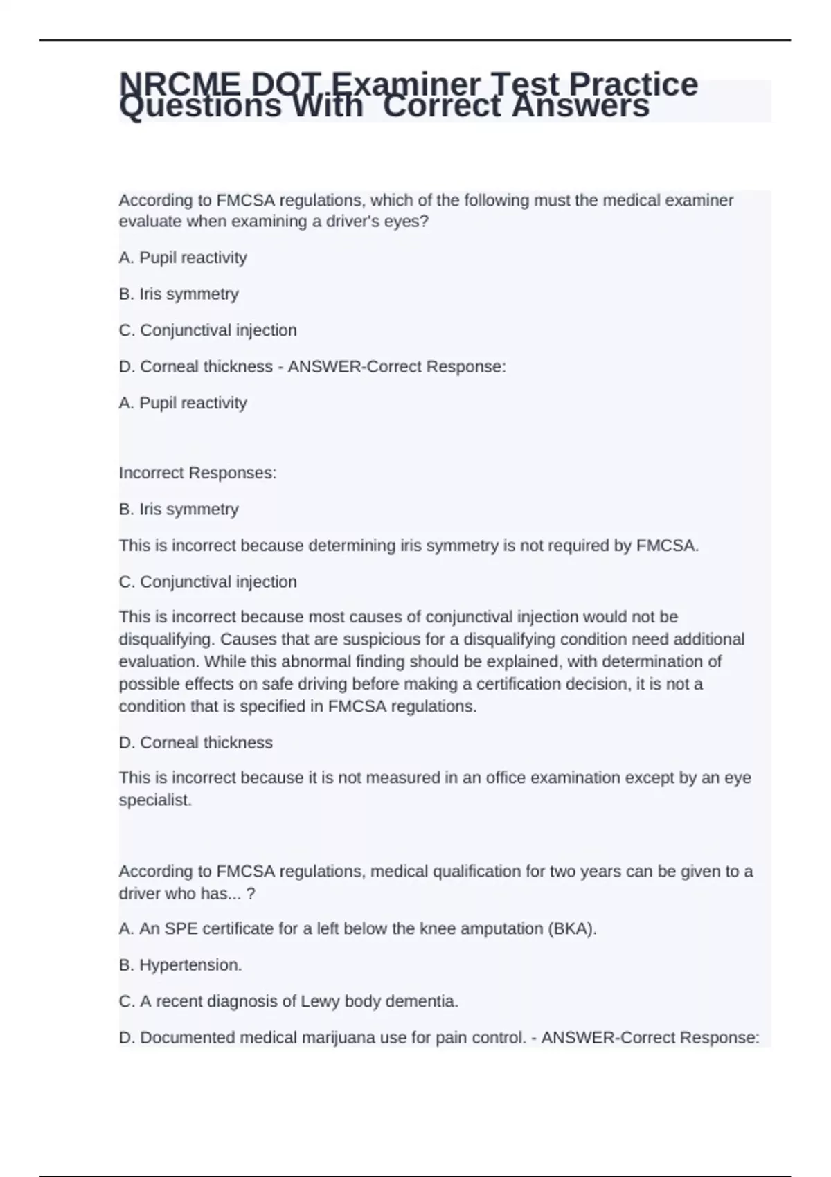 NRCME DOT Examiner Test Practice Questions With Correct Answers