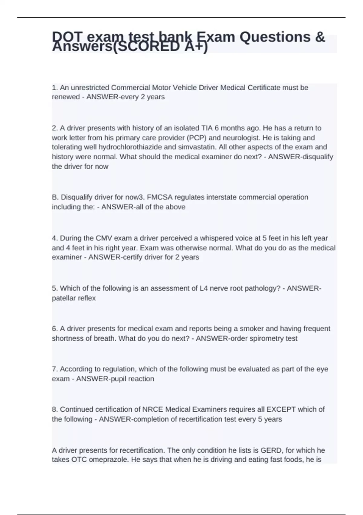 1. An unrestricted Commercial Motor Vehicle Driver Medical Certificate must be renewed - ANSWER-every 2 years 2. A driver presents with history of an isolated TIA 6 months ago. He has a return to work letter from his primary care provider (PCP) and neurologist. He is taking and tolerating well hydrochlorothiazide and simvastatin. All other aspects of the exam and history were normal. What should the medical examiner do next? - ANSWER-disqualify the driver for now B. Disqualify driver for now3. FMCSA regulates interstate commercial operation including the: - ANSWER-all of the above 4. During the CMV exam a driver perceived a whispered voice at 5 feet in his left year and 4 feet in his right year. Exam was otherwise normal. What do you do as the medical examiner - ANSWER-certify driver for 2 years 5. Which of the following is an assessment of L4 nerve root pathology? - ANSWER-patellar reflex 6. A driver presents for medical exam and reports being a smoker and having frequent shortness of breath. What do you do next? - ANSWER-order spirometry test 7. According to regulation, which of the following must be evaluated as part of the eye exam - ANSWER-pupil reaction 8. Continued certification of NRCE Medical Examiners requires all EXCEPT which of the following - ANSWER-completion of recertification test every 5 years A driver presents for recertification. The only condition he lists is GERD, for which he takes OTC omeprazole. He says that when he is driving and eating fast foods, he is more likely to have heartburn than when off‐duty. You should: - ANSWER-correlate history with abdominal exam Which of the following findings is disqualifying? - ANSWER-oxygen saturation 90% The driver presents for recertification and submits an ultrasound report indicating an abdominal aortic aneurysm from two months ago, shortly before he had surgical correction. He has surgical clearance and says he is doing well, has no symptoms. You should: - ANSWER-inform the driver of the 3 month wait before he can become recertified The driver takes diphenhydramine twice a day to treat nasal congestion. What must you document in order tocertify? - ANSWER-cannot drive within 12 hrs of taking diphenhydramine The driver has a history of carpal tunnel repair of her right hand 2 months ago. Her grip strengths are symmetricaland strong. What is necessary in order to qualify this driver? - ANSWER-document her findings for 2 year examination Which of the following abdominal complaint