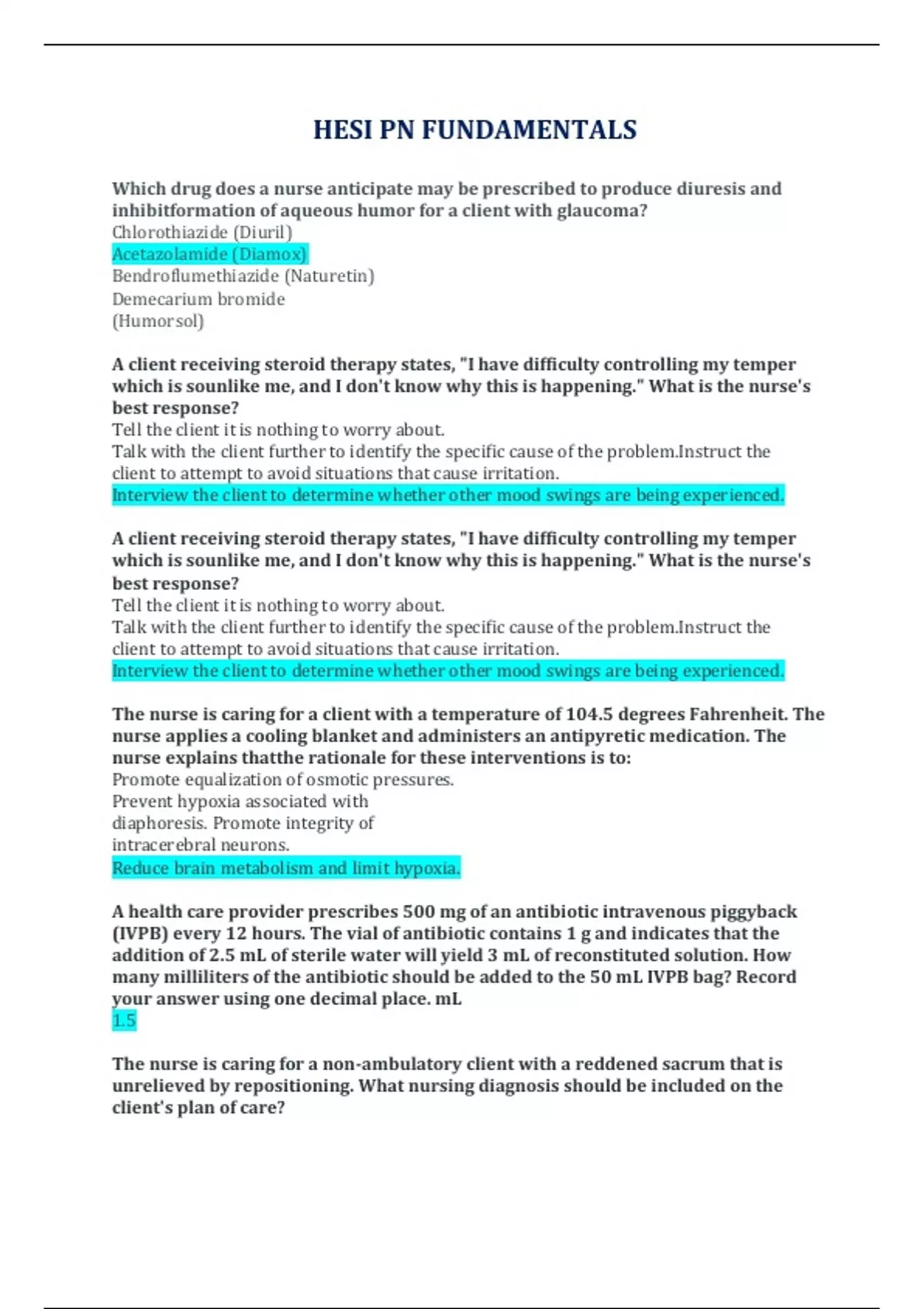 Which drug does a nurse anticipate may be prescribed to produce diuresis and inhibitformation of aqueous humor for a client with glaucoma? Chlorothiazide (Diuril) Acetazolamide (Diamox) Bendroflumethiazide (Naturetin) Demecarium bromide (Humorsol) A client receiving steroid therapy states, "I have difficulty controlling my temper which is sounlike me, and I don't know why this is happening." What is the nurse's best response? Tell the client it is nothing to worry about. Talk with the client further to identify the specific cause of the problem.Instruct the client to attempt to avoid situations that cause irritation. Interview the client to determine whether other mood swings are being experienced. A client receiving steroid therapy states, "I have difficulty controlling my temper which is sounlike me, and I don't know why this is happening." What is the nurse's best response? Tell the client it is nothing to worry about. Talk with the client further to identify the specific cause of the problem.Instruct the client to attempt to avoid situations that cause irritation. Interview the client to determine whether other mood swings are being experienced. The nurse is caring for a client with a temperature of 104.5 degrees Fahrenheit. The nurse applies a cooling blanket and administers an antipyretic medication. The nurse explains thatthe rationale for these interventions is to: Promote equalization of osmotic pressures. Prevent hypoxia associated with diaphoresis. Promote integrity of intracerebral neurons. Reduce brain metabolism and limit hypoxia. A health care provider prescribes 500 mg of an antibiotic intravenous piggyback (IVPB) every 12 hours. The vial of antibiotic contains 1 g and indicates that the addition of 2.5 mL of sterile water will yield 3 mL of reconstituted solution. How many milliliters of the antibiotic should be added to the 50 mL IVPB bag? Record your answer using one decimal place. mL 1.5 The nurse is caring for a non-ambulatory client with a reddened sacrum that is unrelieved by repositioning. What nursing diagnosis should be included on the client's plan of care? Risk for pressure ulcer Risk for impaired skin integrity Impaired skin integrity, related to infrequent turning and repositioning Impaired skin integrity, related to the effects of pressure and shearing force A client has a pressure ulcer that is full thickness with necrosis into the subcutaneous tissue down to the underlying fascia. The nurse should document the assessment finding as which stage of pressure ulcer? Stage I Stage II Stage III Unstageable A pressure ulcer with necrotic tissue is unstageable. The necrotic tissue must be removed before the wound can be staged. A stage I pressure ulcer is defined as an area of persistent redness with no break in skin integrity. A stage II pressure ulcer is a partial-thickness wound with skin loss involving the epidermis, dermis, or both; the ulcer is superficial and may present as an abrasion, blister, or shallow crater. A stage III pressure ulcer involves full thickness tissue loss with visible subcutaneous fat. Bone, tendon, and muscle are not exposed. A client is being admitted for a total hip replacement. When is it necessary for the nurse toensure that a medication reconciliation is completed? Select all that apply. After reporting severe pain On admission to the hospital Upon entering the operating room Before transfer to a rehabilitation facility At time of scheduling for the surgical procedure Medication reconciliation involves the creation of a list of all medications the client is taking and comparing it to the health care provider's prescriptions on admission or when there is a transfer to a different setting or service, or discharge. A change in status does not require medication reconciliation. A medication reconciliation should be completed long before entering the operating room. Total hip replacement is elective surgery, and scheduling takes place before admission; medication reconciliation takes place when the client is admitted. A client is taking lithium sodium (Lithium). The nurse should notify the health care provider for which of the following laboratory values? White blood cell (WBC) count of 15,000 mm3 Negative protein in the urine Blood urea nitrogen (BUN) of 20 mg/dL Prothrombin of 12.0 seconds White cell counts can increase with this drug. The expected range of the WBC count is 5000 to 10,000 mm3 for a healthy adult. Urinalysis, BUN, and prothrombin are not necessary and these are normal values. Often when a family member is dying, the client and the family are at different stages of grieving. During which stage of a client's grieving is the family likely to require more emotional nursing care than the client? Anger Denial Depression Acceptance