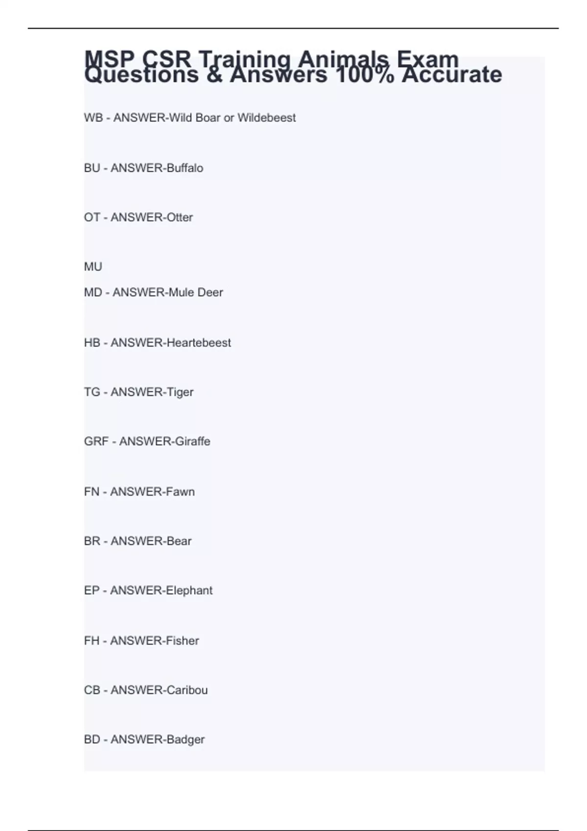 MSP CSR Training Animals Exam Questions & Answers 100% Accurate