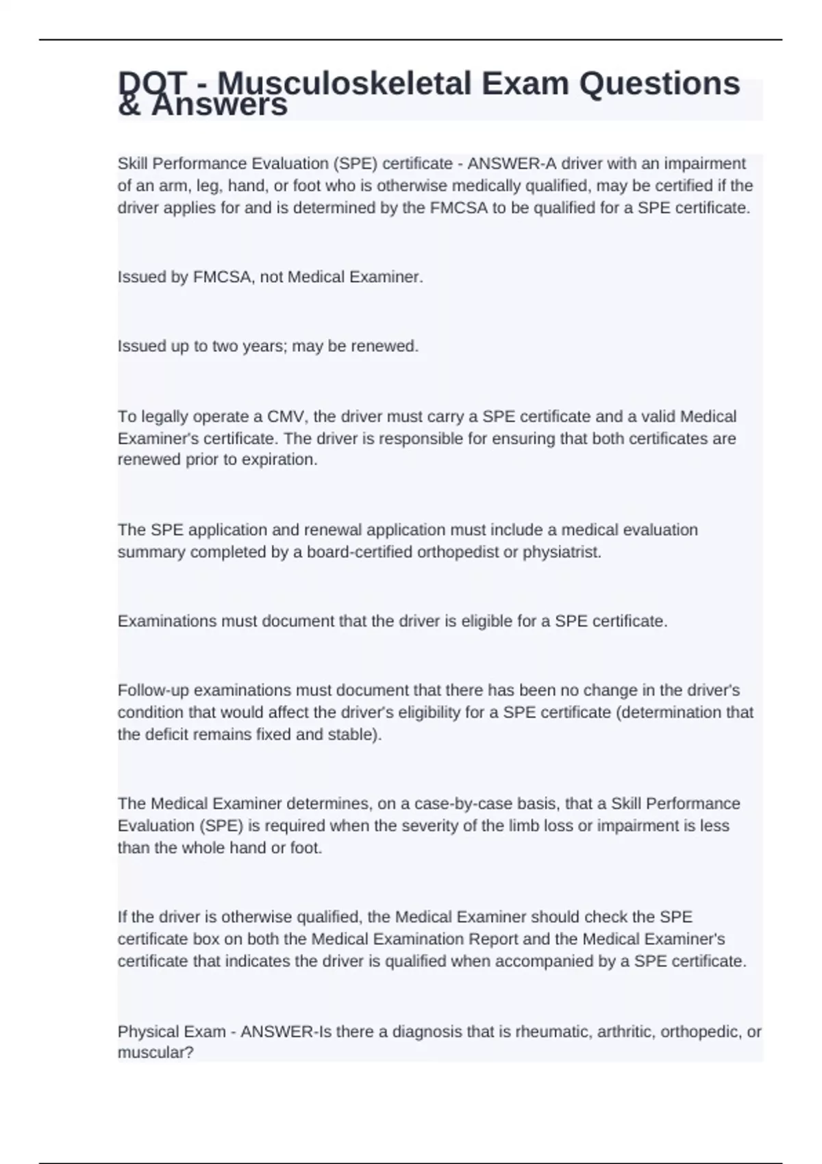 Skill Performance Evaluation (SPE) certificate - ANSWER-A driver with an impairment of an arm, leg, hand, or foot who is otherwise medically qualified, may be certified if the driver applies for and is determined by the FMCSA to be qualified for a SPE certificate. Issued by FMCSA, not Medical Examiner. Issued up to two years; may be renewed. To legally operate a CMV, the driver must carry a SPE certificate and a valid Medical Examiner's certificate. The driver is responsible for ensuring that both certificates are renewed prior to expiration. The SPE application and renewal application must include a medical evaluation summary completed by a board-certified orthopedist or physiatrist. Examinations must document that the driver is eligible for a SPE certificate. Follow-up examinations must document that there has been no change in the driver's condition that would affect the driver's eligibility for a SPE certificate (determination that the deficit remains fixed and stable). The Medical Examiner determines, on a case-by-case basis, that a Skill Performance Evaluation (SPE) is required when the severity of the limb loss or impairment is less than the whole hand or foot. If the driver is otherwise qualified, the Medical Examiner should check the SPE certificate box on both the Medical Examination Report and the Medical Examiner's certificate that indicates the driver is qualified when accompanied by a SPE certificate. Physical Exam - ANSWER-Is there a diagnosis that is rheumatic, arthritic, orthopedic, or muscular? Examination findings need to go beyond minimums; the medical examiner determines appropriate specialist(s) that could or should be consulted. Is the clinical course reversible, episodic, degenerative, or fixed? Fixed and stable, affecting a hand, foot, arm, or leg, driver may qualify for a Skill Performance Evaluation (SPE) certificate.