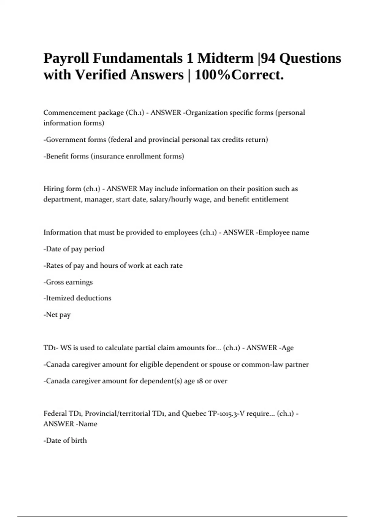 Payroll Fundamentals 1 Midterm |94 Questions with Verified Answers | 100%Correct. Commencement package (Ch.1) - ANSWER -Organization specific forms (personal information forms) -Government forms (federal and provincial personal tax credits return) -Benefit forms (insurance enrollment forms) Hiring form (ch.1) - ANSWER May include information on their position such as department, manager, start date, salary/hourly wage, and benefit entitlement Information that must be provided to employees (ch.1) - ANSWER -Employee name -Date of pay period -Rates of pay and hours of work at each rate -Gross earnings -Itemized deductions -Net pay TD1- WS is used to calculate partial claim amounts for... (ch.1) - ANSWER -Age -Canada caregiver amount for eligible dependent or spouse or common-law partner -Canada caregiver amount for dependent(s) age 18 or over Federal TD1, Provincial/territorial TD1, and Quebec TP-1015.3-V require... (ch.1) - ANSWER -Name -Date of birth Payroll Fundamentals 1 Midterm |94 Questions with Verified Answers | 100%Correct. -Social insurance number Other credits employees can claim on their Federal and Provincial/Territorial TD1 to lower taxes (ch.1) - ANSWER -Being a caregiver -Being over 65 -Receiving a pension -Being or supporting a student in post-secondary studies -Being disabled -Supporting a spouce -Living alone (Quebec) -Having children under 18 (Saskatchewan and Yukon) Do you have to claim basic personal provincial/territorial credits? (ch.1) - ANSWER -No, if only doing basic -Yes, if claiming children under 18 (Sakatchewan and Yukon) -Yes, always (Quebec) Employers should review TD1 and TP-1015.3-V forms to ensure (ch.2) - ANSWER -Correct employee name, Date of birth, Address, and SIN -Correct amounts on the form -Amounts claimed are totaled correctly -Form does not contain obvious false statements -The form is signed a dated What certain information must appear on an employee's statement of wages? (ch.2) - ANSWER -Name -Rate of pay and hours worked at each rate -Date of pay period -Gross and net pay -Itemized deductions Renumeration (ch.2) - ANSWER Employee received compensation or pay for the services they perform -AKA employee income when employer-employee relationship exists Employee income can be categorized into what? (ch.2) - ANSWER -Earnings -Allowances -Benefits -Taxable expense reimbursements Earnings can be paid as... (ch.2) - ANSWER -Salary -Rate for each hour worked -Rate per piece of goods produced or picked -Disability payment for time off due to illness -Payment for vacation time -Premium payment for overtime -Premium payment for hours worked on a shift.