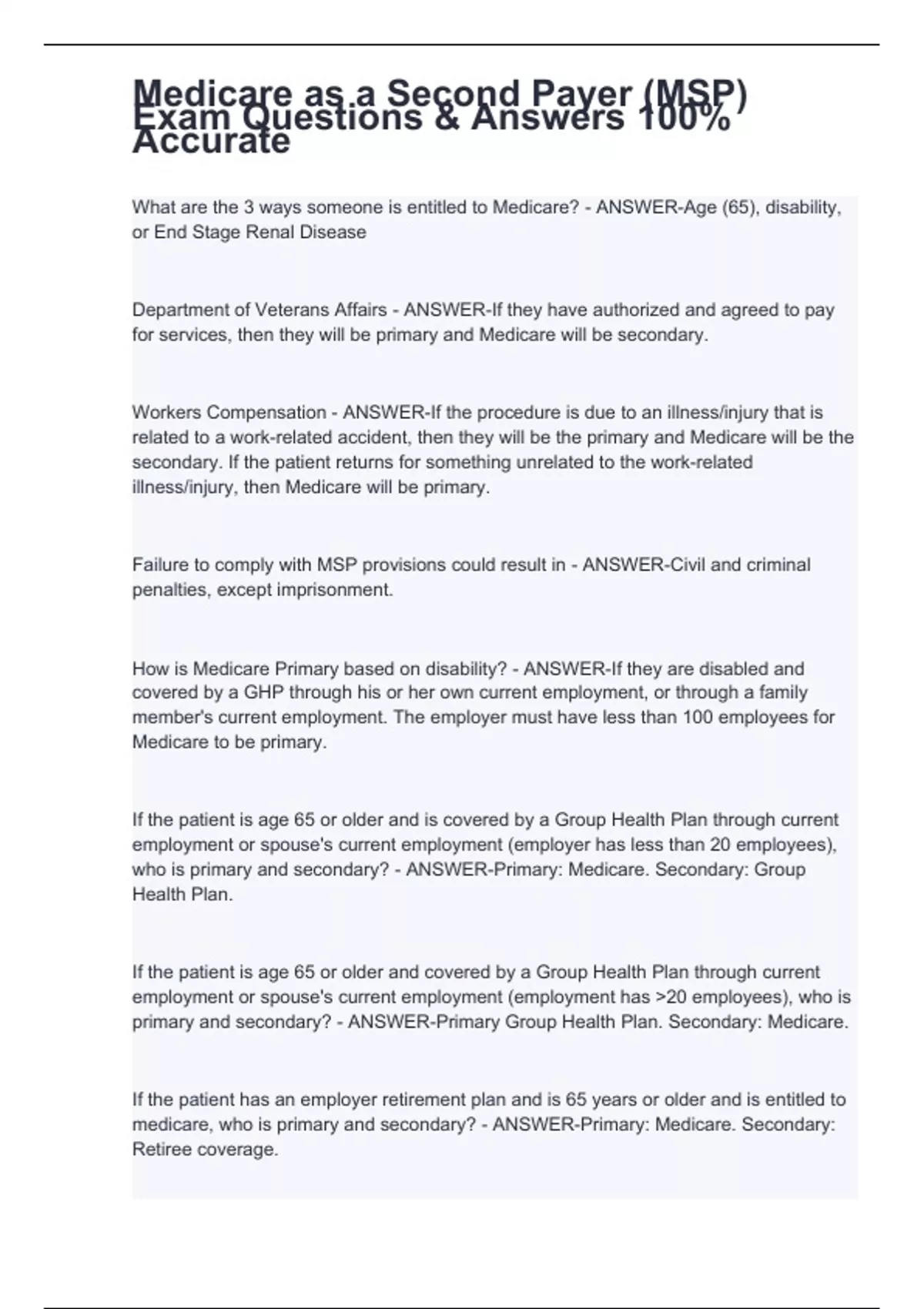 Medicare as a Second Payer (MSP) Exam Questions & Answers 100% Accurate