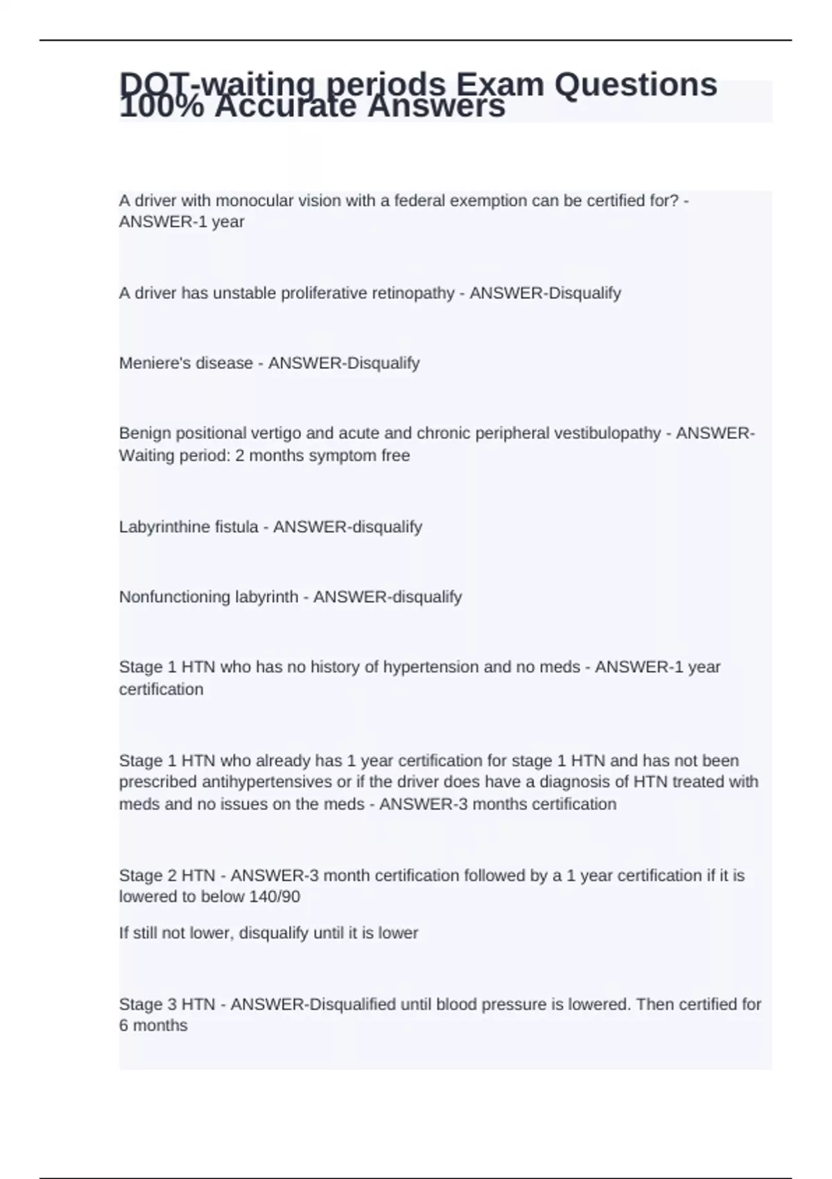 A driver with monocular vision with a federal exemption can be certified for? - ANSWER-1 year A driver has unstable proliferative retinopathy - ANSWER-Disqualify Meniere's disease - ANSWER-Disqualify Benign positional vertigo and acute and chronic peripheral vestibulopathy - ANSWER-Waiting period: 2 months symptom free Labyrinthine fistula - ANSWER-disqualify Nonfunctioning labyrinth - ANSWER-disqualify Stage 1 HTN who has no history of hypertension and no meds - ANSWER-1 year certification Stage 1 HTN who already has 1 year certification for stage 1 HTN and has not been prescribed antihypertensives or if the driver does have a diagnosis of HTN treated with meds and no issues on the meds - ANSWER-3 months certification Stage 2 HTN - ANSWER-3 month certification followed by a 1 year certification if it is lowered to below 140/90 If still not lower, disqualify until it is lower Stage 3 HTN - ANSWER-Disqualified until blood pressure is lowered. Then certified for 6 months Secondary HTN with surgical intervention - ANSWER-Wait period: 3 months post surgical correction Certification: 1 year Anticoagulant therapy - ANSWER-Waiting period: 1 month stabilized Max certification: 1 year Must have INR results at exam and have monthly INR monitoring AAA - ANSWER-Waiting period: 3 months if post surgical repair Max Certification: 1 year Recommend to certify someone with AAA if: - ANSWER-Less than 4cm and asymptomatic. 4-5cm and asymptomatic and has cardiovascular specialist clearance. Surgically repaired. Recommend not to certify someone with AAA