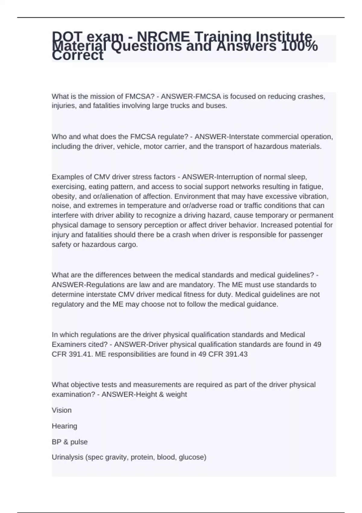DOT exam - NRCME Training Institute Material Questions and Answers 100% Correct