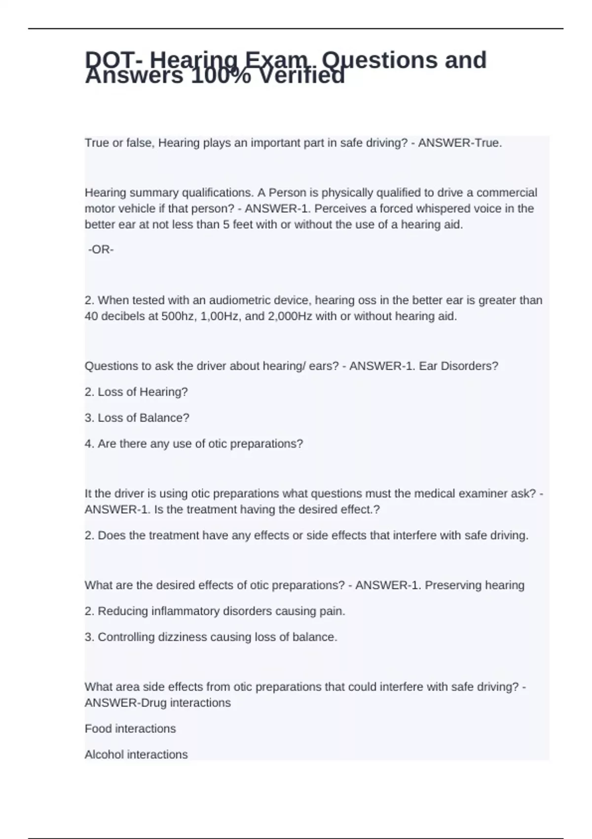 DOT- Hearing Exam Questions and Answers 100% Verified