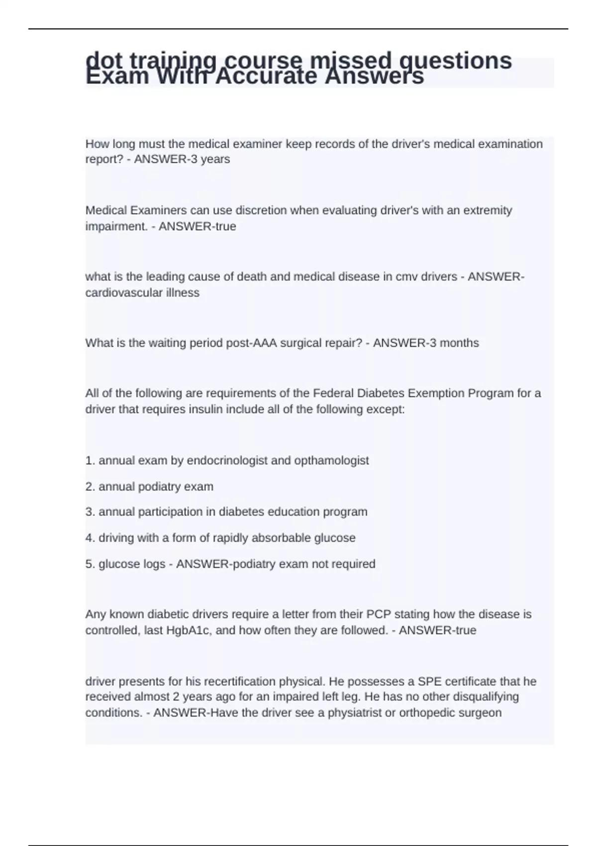 How long must the medical examiner keep records of the driver's medical examination report? - ANSWER-3 years Medical Examiners can use discretion when evaluating driver's with an extremity impairment. - ANSWER-true what is the leading cause of death and medical disease in cmv drivers - ANSWER-cardiovascular illness What is the waiting period post-AAA surgical repair? - ANSWER-3 months All of the following are requirements of the Federal Diabetes Exemption Program for a driver that requires insulin include all of the following except: 1. annual exam by endocrinologist and opthamologist 2. annual podiatry exam 3. annual participation in diabetes education program 4. driving with a form of rapidly absorbable glucose 5. glucose logs - ANSWER-podiatry exam not required Any known diabetic drivers require a letter from their PCP stating how the disease is controlled, last HgbA1c, and how often they are followed. - ANSWER-true driver presents for his recertification physical. He possesses a SPE certificate that he received almost 2 years ago for an impaired left leg. He has no other disqualifying conditions. - ANSWER-Have the driver see a physiatrist or orthopedic surgeon A driver with an SPE certificate must also have a medical evaluation by a physiatrist or orthopedic surgeon to verify any medical changes since last certification. An SPE certification is valid for 2 years and must always be carried with the driver while on duty. An SPE certification can be given to a driver with a progressive deficit. t/f - ANSWER-f- only fixed deficit A 57 year old male presents for certification. On physical exam, he has tenderness to palpation over his lumbar spine. The rest of the exam was unremarkable. - ANSWER-CORRECT ANSWER: Obtain radiographic imaging or further evaluation