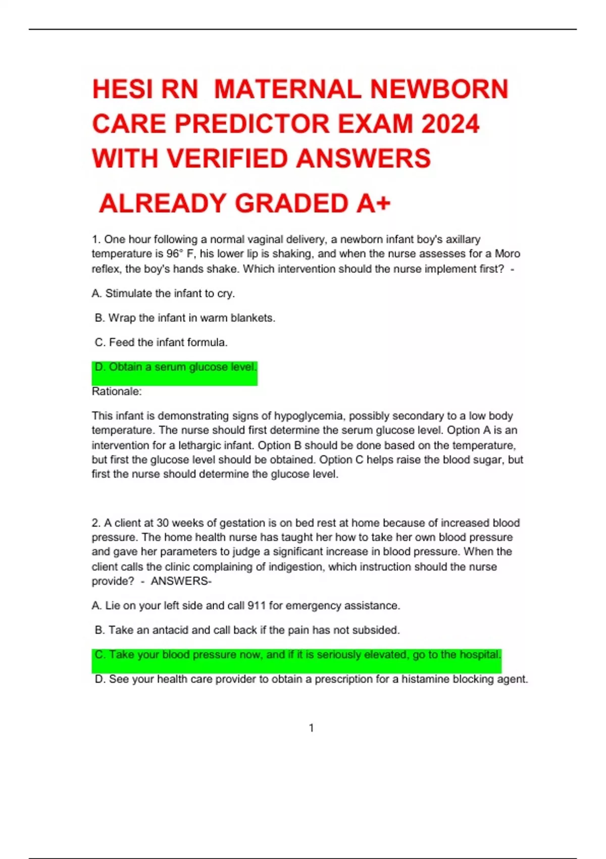 HESI RN MATERNAL NEWBORN CARE PREDICTOR EXAM 2024 WITH VERIFIED ANSWERS ALREADY GRADED A+ HESI RN MATERNAL NEWBORN CARE PREDICTOR EXAM 2024 WITH VERIFIED ANSWERS ALREADY GRADED A+