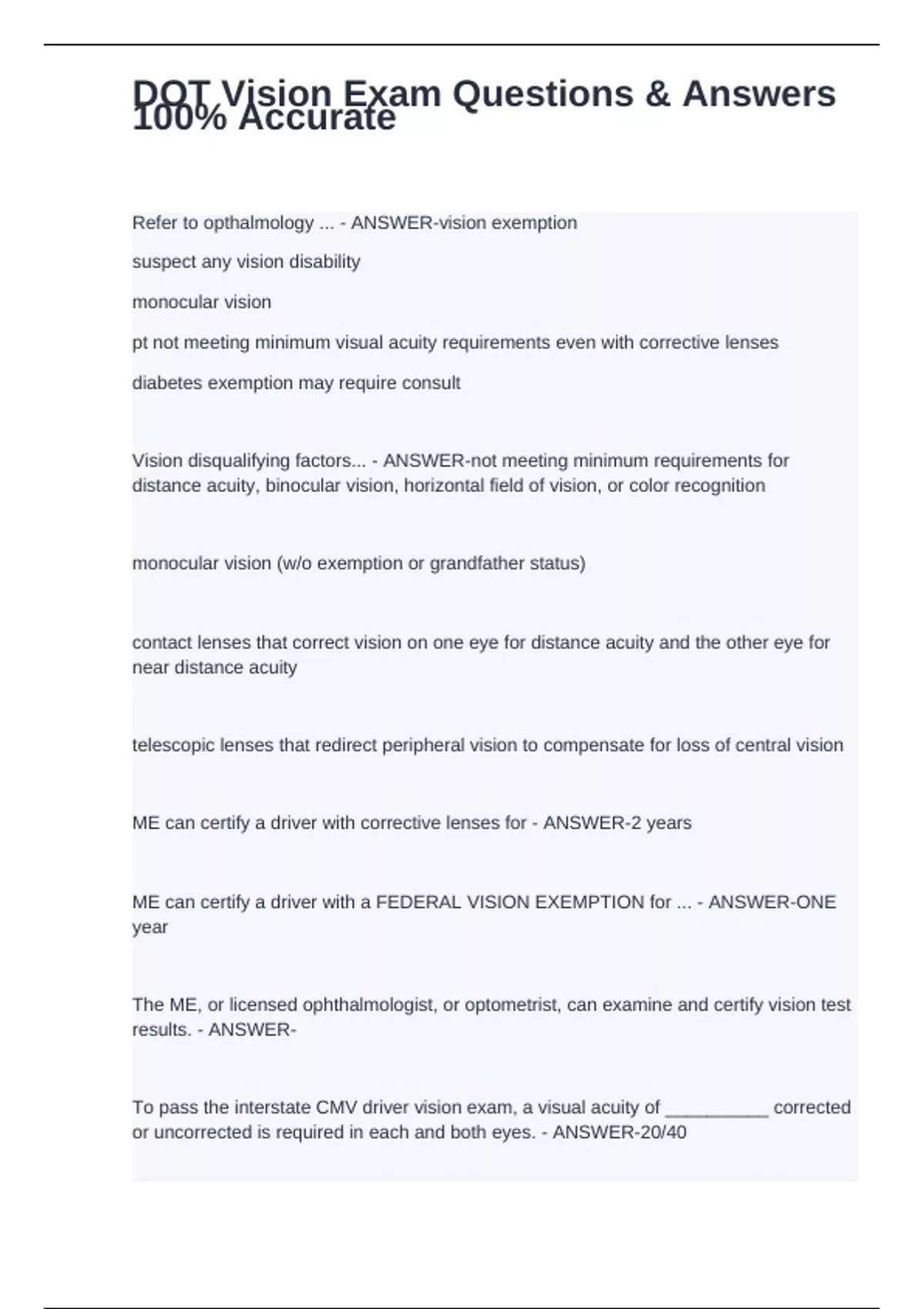 DOT Vision Exam Questions & Answers 100% Accurate