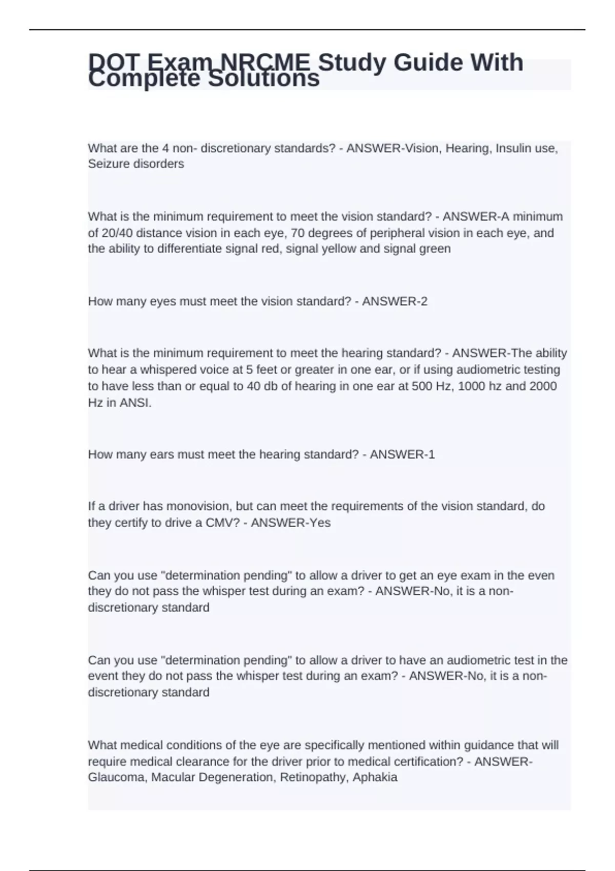 What are the 4 non- discretionary standards? - ANSWER-Vision, Hearing, Insulin use, Seizure disorders What is the minimum requirement to meet the vision standard? - ANSWER-A minimum of 20/40 distance vision in each eye, 70 degrees of peripheral vision in each eye, and the ability to differentiate signal red, signal yellow and signal green How many eyes must meet the vision standard? - ANSWER-2 What is the minimum requirement to meet the hearing standard? - ANSWER-The ability to hear a whispered voice at 5 feet or greater in one ear, or if using audiometric testing to have less than or equal to 40 db of hearing in one ear at 500 Hz, 1000 hz and 2000 Hz in ANSI. How many ears must meet the hearing standard? - ANSWER-1 If a driver has monovision, but can meet the requirements of the vision standard, do they certify to drive a CMV? - ANSWER-Yes Can you use "determination pending" to allow a driver to get an eye exam in the even they do not pass the whisper test during an exam? - ANSWER-No, it is a non-discretionary standard Can you use "determination pending" to allow a driver to have an audiometric test in the event they do not pass the whisper test during an exam? - ANSWER-No, it is a non-discretionary standard What medical conditions of the eye are specifically mentioned within guidance that will require medical clearance for the driver prior to medical certification? - ANSWER-Glaucoma, Macular Degeneration, Retinopathy, Aphakia Can a driver meet the vision standard using glasses or contacts? - ANSWER-Yes Can a driver meet the hearing standard using hearing aids? - ANSWER-Yes A driver has an audiometric test. His hearing loss in ANSI while wearing hearing aids is 40db left ear; and 43 db right ear. Do he meet the standard? - ANSWER-Yes. Because one ear meets the standard (40 in the left ear meets the requirement) his is capable of being certified to drive. If a driver does not meet the vision standard, is it possible for them to still drive a CMV? - ANSWER-Yes, they must apply for a vision exemption If a driver does not meet the hearing standard, is it possible for them to still drive a CMV? - ANSWER-Yes with a hearing exemption What is the maximum certification period for a driver with Stage 1 Htn? - ANSWER-1 year
