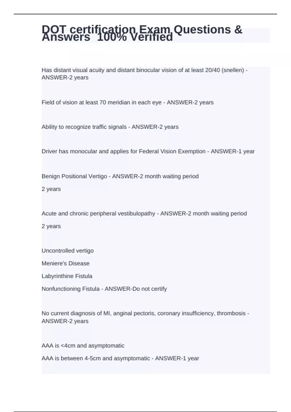 Has distant visual acuity and distant binocular vision of at least 20/40 (snellen) - ANSWER-2 years Field of vision at least 70 meridian in each eye - ANSWER-2 years Ability to recognize traffic signals - ANSWER-2 years Driver has monocular and applies for Federal Vision Exemption - ANSWER-1 year Benign Positional Vertigo - ANSWER-2 month waiting period 2 years Acute and chronic peripheral vestibulopathy - ANSWER-2 month waiting period 2 years Uncontrolled vertigo Meniere's Disease Labyrinthine Fistula Nonfunctioning Fistula - ANSWER-Do not certify No current diagnosis of MI, anginal pectoris, coronary insufficiency, thrombosis - ANSWER-2 years AAA is <4cm and asymptomatic AAA is between 4-5cm and asymptomatic - ANSWER-1 year AAA is surgicaly repaired - ANSWER-3 month waiting period 1 year AAA is symptomatic AAA recommended for surgical repair AAA is between 4-5cm and has not been cleared AAA has increased by more than 0.5cm in the past 6 months - ANSWER-Do not certify