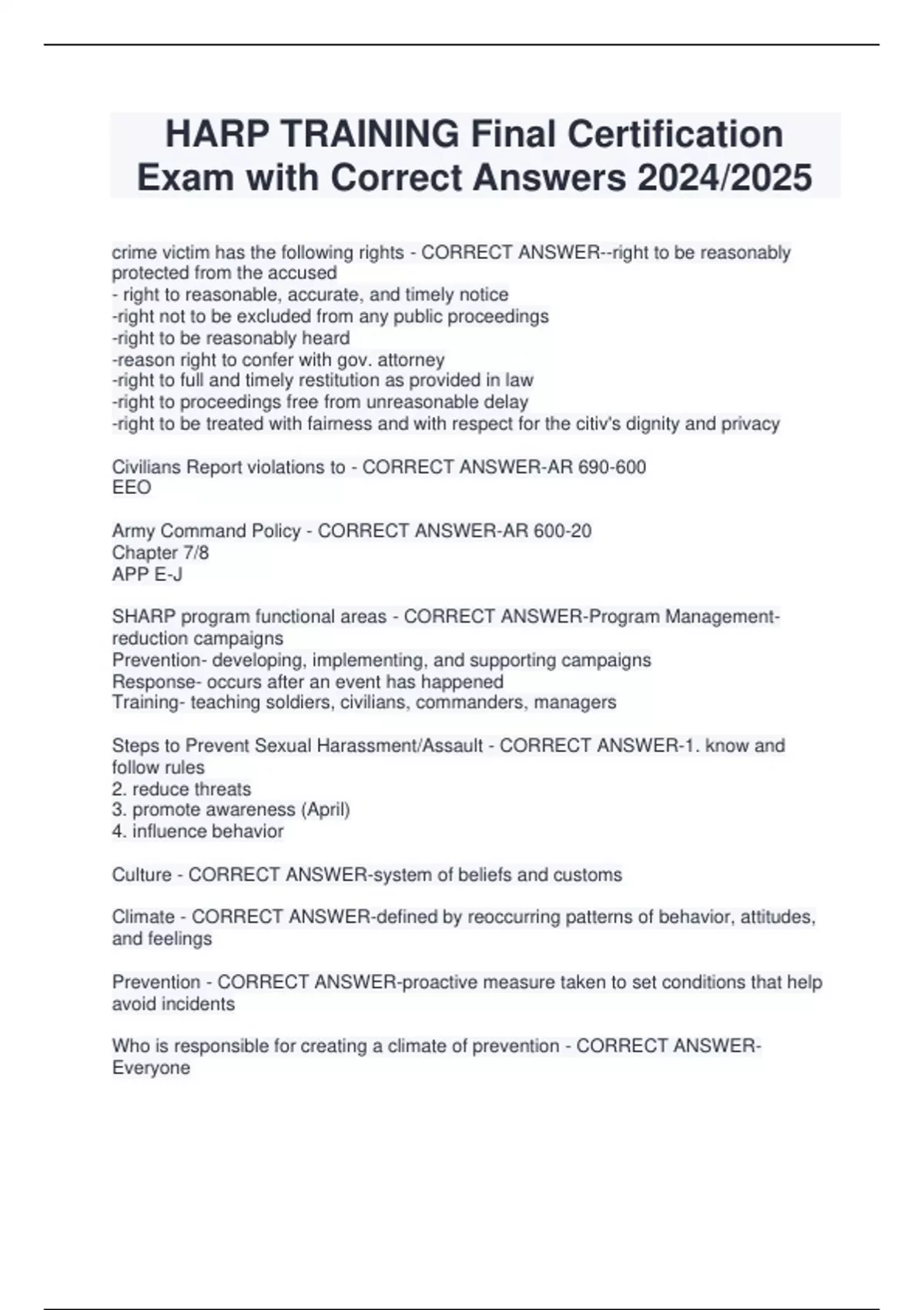 HARP TRAINING Final Certification Exam with Correct Answers 2024/2025 crime victim has the following rights - CORRECT ANSWER--right to be reasonably protected from the accused - right to reasonable, accurate, and timely notice -right not to be excluded from any public proceedings -right to be reasonably heard -reason right to confer with gov. attorney -right to full and timely restitution as provided in law -right to proceedings free from unreasonable delay -right to be treated with fairness and with respect for the citiv's dignity and privacy Civilians Report violations to - CORRECT ANSWER-AR 690-600 EEO Army Command Policy - CORRECT ANSWER-AR 600-20 Chapter 7/8 APP E-J SHARP program functional areas - CORRECT ANSWER-Program Managementreduction campaigns Prevention- developing, implementing, and supporting campaigns Response- occurs after an event has happened Training- teaching soldiers, civilians, commanders, managers Steps to Prevent Sexual Harassment/Assault - CORRECT ANSWER-1. know and follow rules 2. reduce threats 3. promote awareness (April) 4. influence behavior Culture - CORRECT ANSWER-system of beliefs and customs Climate - CORRECT ANSWER-defined by reoccurring patterns of behavior, attitudes, and feelings Prevention - CORRECT ANSWER-proactive measure taken to set conditions that help avoid incidents Who is responsible for creating a climate of preve