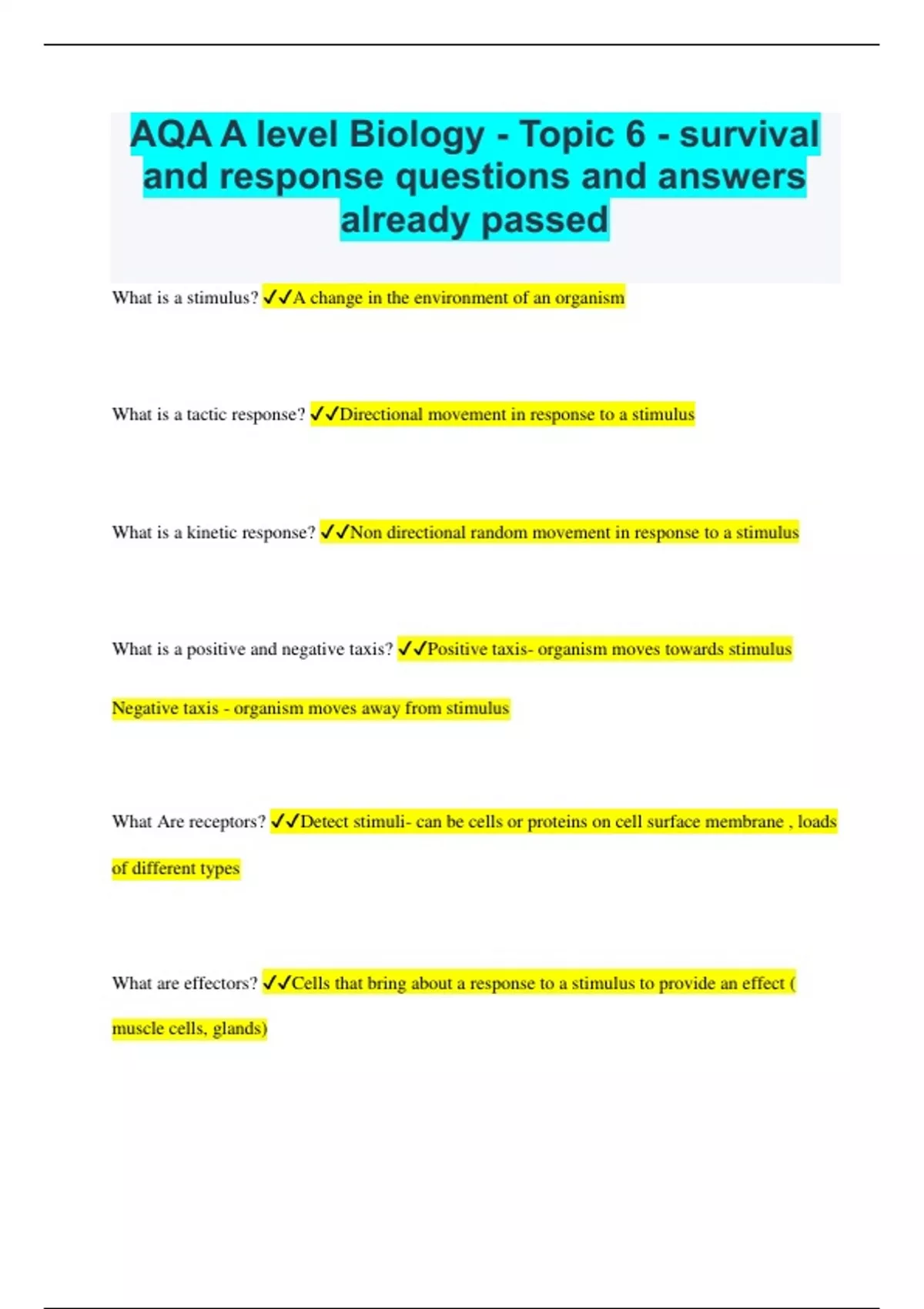 AQA A level Biology - Topic 6 - survival and response questions and answers already passed 2024