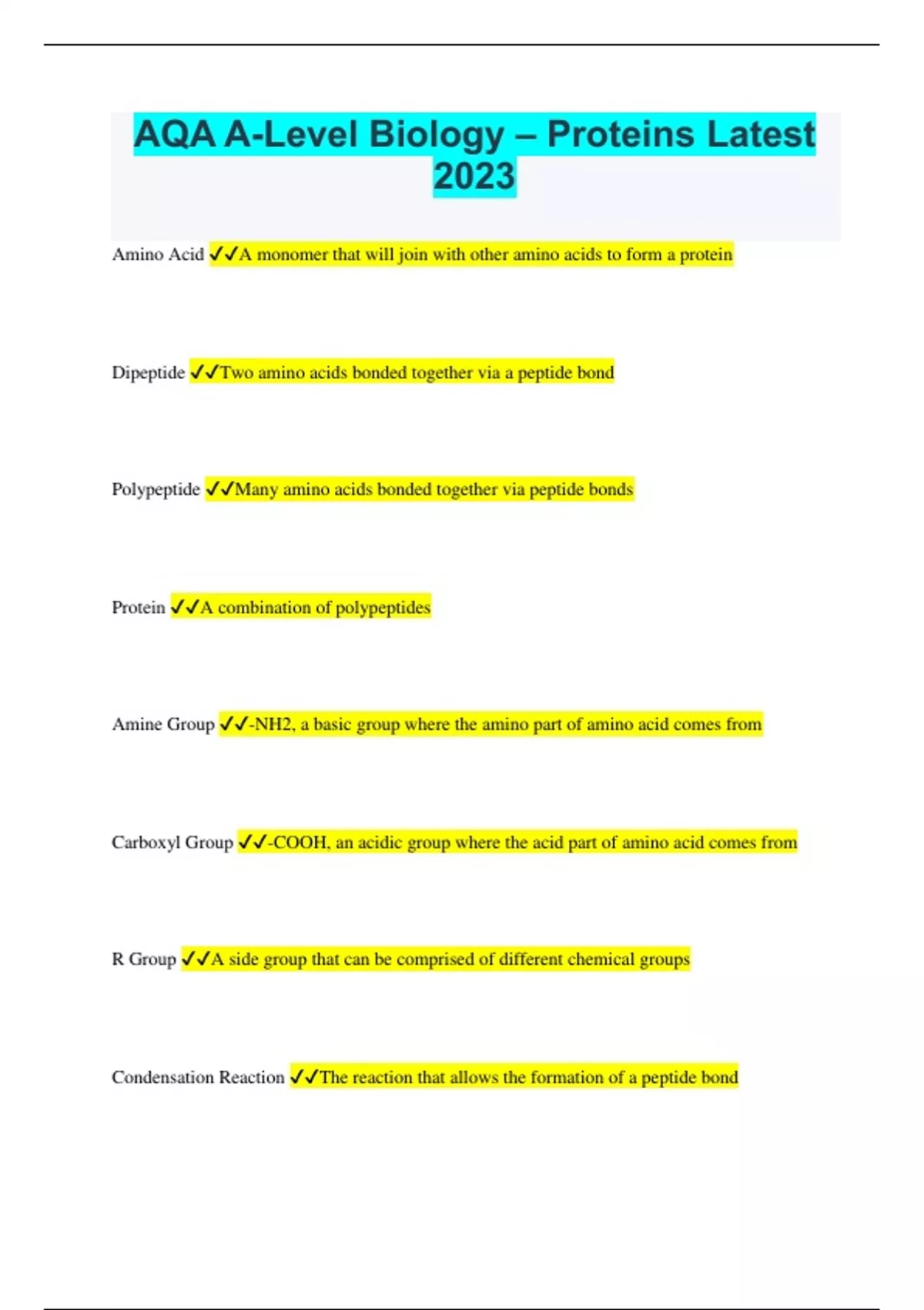 Dipeptide Two amino acids bonded together via a peptide bond Polypeptide Many amino acids bonded together via peptide bonds Protein A combination of polypeptides Amine Group -NH2, a basic group where the amino part of amino acid comes from