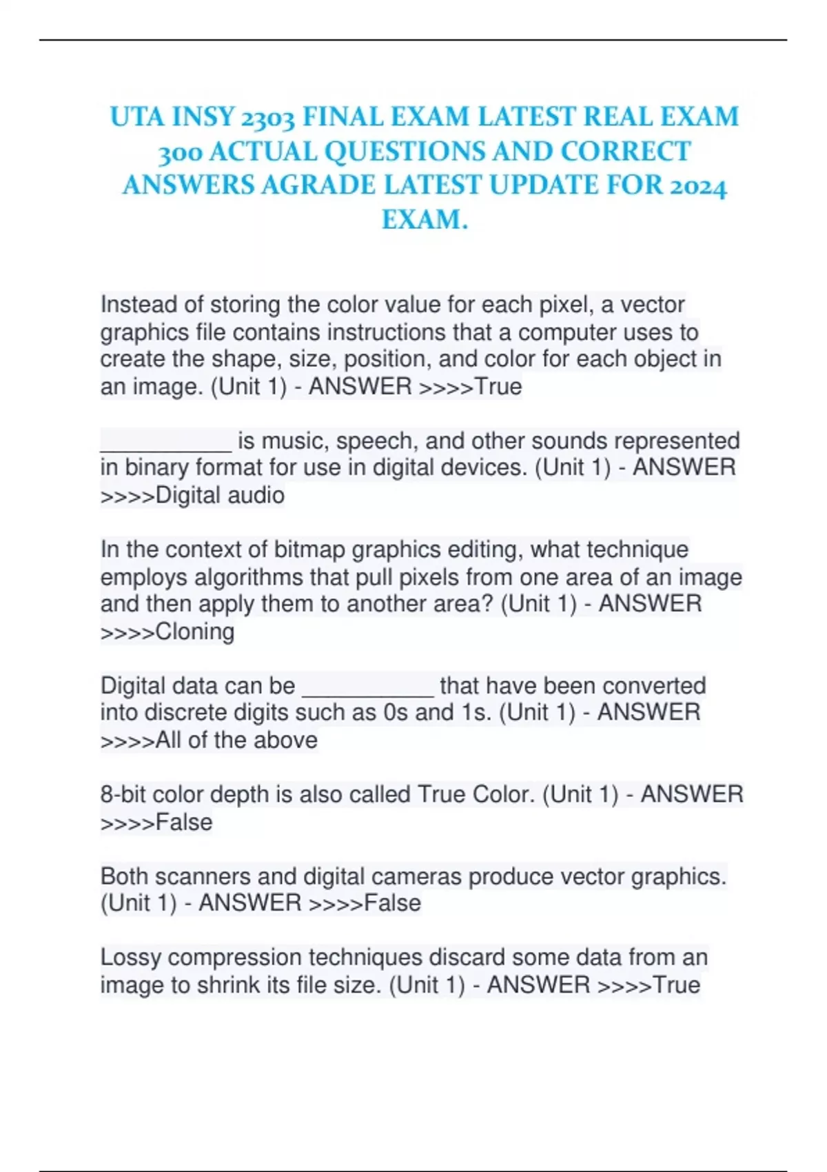 Instead of storing the color value for each pixel, a vector graphics file contains instructions that a computer uses to create the shape, size, position, and color for each object in an image. (Unit 1) - ANSWER >>>>True __________ is music, speech, and other sounds represented in binary format for use in digital devices. (Unit 1) - ANSWER >>>>Digital audio In the context of bitmap graphics editing, what technique employs algorithms that pull pixels from one area of an image and then apply them to another area? (Unit 1) - ANSWER >>>>Cloning Digital data can be __________ that have been converted into discrete digits such as 0s and 1s. (Unit 1) - ANSWER >>>>All of the above 8-bit color depth is also called True Color. (Unit 1) - ANSWER >>>>False Both scanners and digital cameras produce vector graphics. (Unit 1) - ANSWER >>>>False Lossy compression techniques discard some data from an image to shrink its file size. (Unit 1) - ANSWER >>>>True The _______ number system allows digital devices to represent virtually any number simply by using 0s and 1s. (Unit 1) - ANSWER >>>>Binary Most graphics software uses a process called pixel _________ to create new pixels by averaging the colors of nearby pixels. (Unit 1) - ANSWER >>>>Interpolation MIDI files are less compact than digital audio files. (Unit 1) - ANSWER >>>>False Which of the following options are well suited for using vector graphics? (Unit 1) - ANSWER >>>>All of the above A(n) _______ is the software that compresses a video stream when a video is stored, and decompresses the file when the video is played. (Unit 1) - ANSWER >>>>Codec One of the main disadvantages of MIDI is that it cannot produce vocals. (Unit 1) - ANSWER >>>>True Most music for portable media players is stored in _______ audio file formats. (Unit 1) - ANSWER >>>>Compressed Which of the following is NOT a type of bitmap format? (Unit 1) - ANSWER >>>>ZIP In digital video, a lower resolution reduces the bit rate. (Unit 1) - ANSWER >>>>True TIFF, PNG, and GIF graphics formats offer lossy compression. (Unit 1) - ANSWER >>>>False A bitmap graphic is composed of a grid of tiny rectangular cells. (Unit 1) - ANSWER >>>>True Lossy compression throws away some of the original data during the compression process. (Unit 1) - ANSWER >>>>True _________ enables people to control software with spoken commands, as well as dictate text into a word processing document. (Unit 1) - ANSWER >>>>Speech recognition To conserve space, applications that require high-quality sound use low sampling rates. (Unit 1) - ANSWER >>>>False