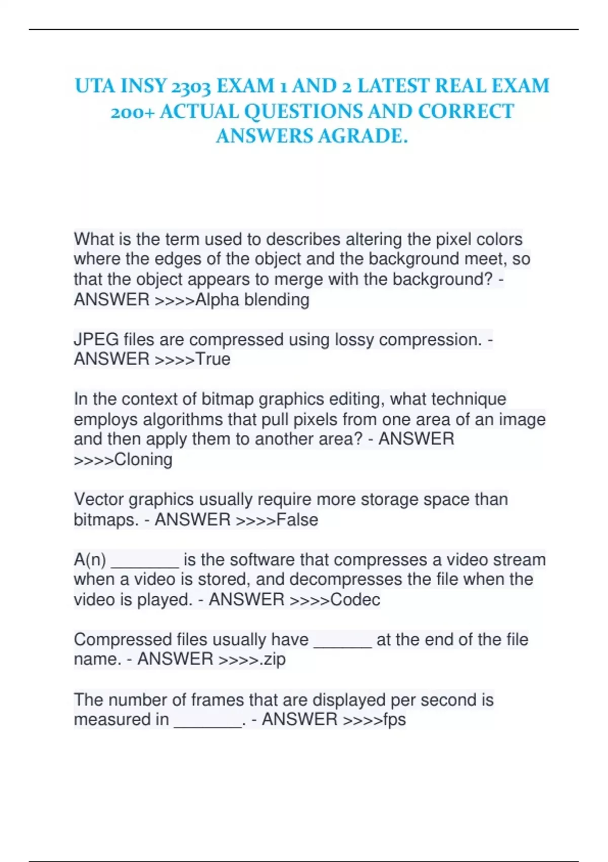 What is the term used to describes altering the pixel colors where the edges of the object and the background meet, so that the object appears to merge with the background? - ANSWER >>>>Alpha blending JPEG files are compressed using lossy compression. - ANSWER >>>>True In the context of bitmap graphics editing, what technique employs algorithms that pull pixels from one area of an image and then apply them to another area? - ANSWER >>>>Cloning Vector graphics usually require more storage space than bitmaps. - ANSWER >>>>False A(n) _______ is the software that compresses a video stream when a video is stored, and decompresses the file when the video is played. - ANSWER >>>>Codec Compressed files usually have ______ at the end of the file name. - ANSWER >>>>.zip The number of frames that are displayed per second is measured in _______. - ANSWER >>>>fps 3-D graphics can be animated. - ANSWER >>>>True _________ enables people to control software with spoken commands, as well as dictate text into a word processing document. - ANSWER >>>>Speech recognition Which of the following is NOT a format that is used for digital audio? - ANSWER >>>>DOC Most graphics software uses a process called pixel _________ to create new pixels by averaging the colors of nearby pixels. - ANSWER >>>>Interpolation To conserve space, applications that require high-quality sound use low sampling rates. - ANSWER >>>>False ASCII requires __________ bits for each character. - ANSWER >>>>Seven Which of the following file extensions is NOT a vector graphic? - ANSWER >>>>.tif The _______ number system allows digital devices to represent virtually any number simply by using 0s and 1s. - ANSWER >>>>Binary Bitmap graphics are resolution dependent because each element is a discrete pixel. - ANSWER >>>>True Text-to-speech software analyzes the words in a section of text, finds corresponding phonemes, and combines them into sentences for output. - ANSWER >>>>True