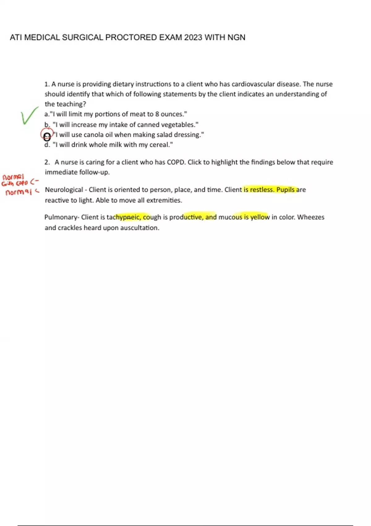 1. A nurse is providing dietary instructions to a client who has cardiovascular disease. The nurse