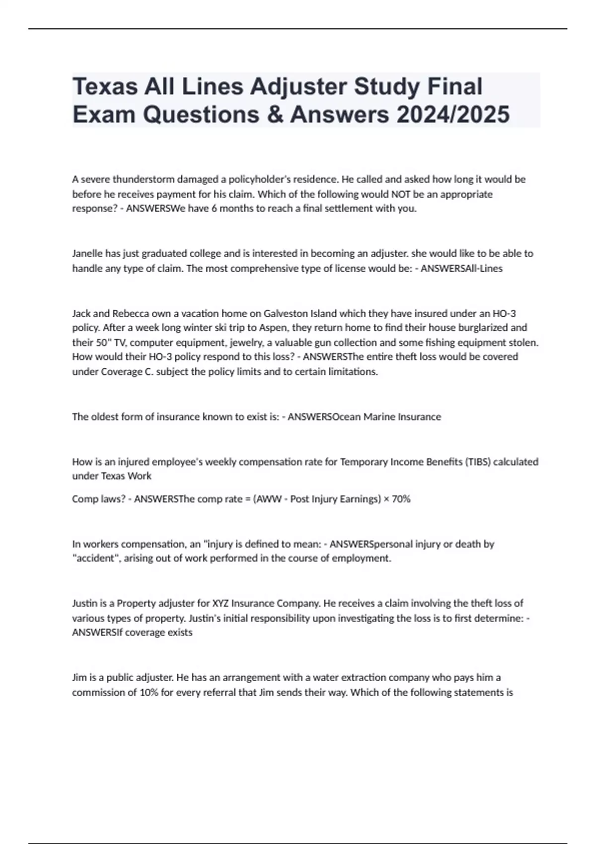 Texas All Lines Adjuster Study Final Exam Questions & Answers 2024/2025 A severe thunderstorm damaged a policyholder's residence. He called and asked how long it would be before he receives payment for his claim. Which of the following would NOT be an appropriate response? - ANSWERSWe have 6 months to reach a final settlement with you. Janelle has just graduated college and is interested in becoming an adjuster. she would like to be able to handle any type of claim. The most comprehensive type of license would be: - ANSWERSAll-Lines Jack and Rebecca own a vacation home on Galveston Island which they have insured under an HO-3 policy. After a week long winter ski trip to Aspen, they return home to find their house burglarized and their 50" TV, computer equipment, jewelry, a valuable gun collection and some fishing equipment stolen. How would their HO-3 policy respond to this loss? - ANSWERSThe entire theft loss would be covered under Coverage C. subject the policy limits and to certain limitations. The oldest form of insurance known to exist is: - ANSWERSOcean Marine Insurance How is an injured employee's weekly compensation rate for Temporary Income Benefits (TIBS) calculated under Texas Work Comp laws? - ANSWERSThe comp rate = (AWW - Post Injury Earnings) × 70% In workers compensation, an "injury is defined to mean: - ANSWERSpersonal injury or death by "accident", arising out of work performed in the course of employment. Justin is a Property adjuster for XYZ Insurance Company. He receives a claim involving the theft loss of various types of property. Justin's initial responsibility upon investigating the loss is to first determine: - ANSWERSIf coverage exists Jim is a public adjuster. He has an arrangement with a water extraction company who pays him a commission of 10% for every referral that Jim sends their way. Which of the following statements is