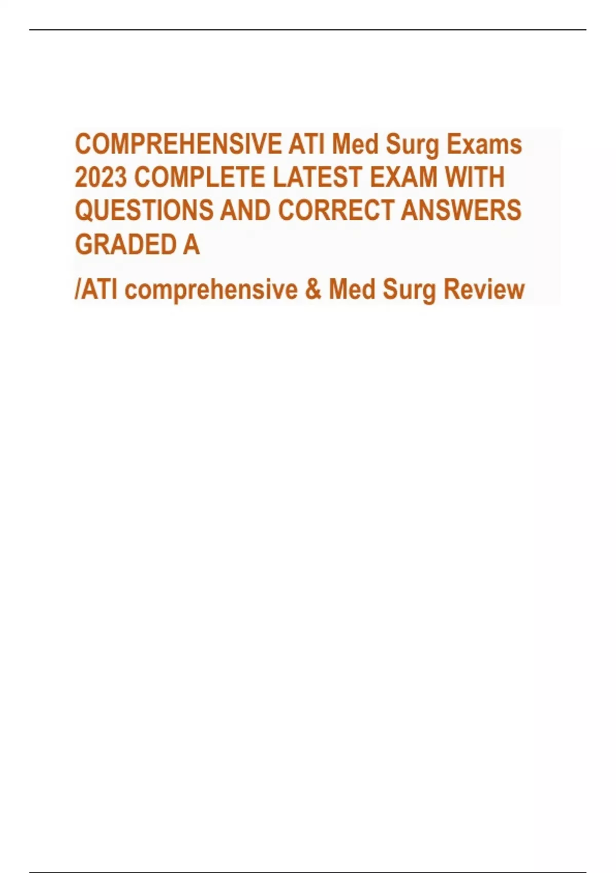 COMPREHENSIVE ATI Med Surg Exams 2023 COMPLETE LATEST EXAM WITH QUESTIONS AND CORRECT ANSWERS GRADED A /ATI comprehensive & Med Surg Review Do not delegate - CORRECT ANSW-What you can EAT E-evaluate A-assess T-teach Better peripheral perfusion? - CORRECT ANSW-EleVate Veins, DAngle Arteries APGAR - CORRECT ANSW-Appearance (all pink, pink and blue, blue (pale) Pulse (>100, <100, absent) Grimace (cough, grimace, no response) Activity (flexed, flaccid, limp) Respirations (strong cry, weak cry, absent) Airborne precautions - CORRECT ANSW-My chicken hez tb (measles, chickenpox (varicella) Herpes zoster/shingles TB Airborne precautions protective equip - CORRECT ANSW-private room, neg pressure with 6-12 air exchanges/hr mask N95 for TB Droplet precautions - CORRECT ANSW-spiderman! sepsis, scarlet fever, streptococcal pharyngitis, parvovirus, pneumonia, pertussis, influenza, diptheria, epiglottitis, rubella, mumps, meningitis, mycoplasma or meningeal pneumonia, adeNovirus (Private room or cohort mask!) After Myringotomy - CORRECT ANSW-position on the side of AFFECTED ear, allows drainage. After Cateract surgery - CORRECT ANSW-pt sleep on UNAFFECTED side with a night shield for 1-4 weeks after Thyroidectomy - CORRECT ANSW-low or semi-fowler's position, support head, neck and shoulders