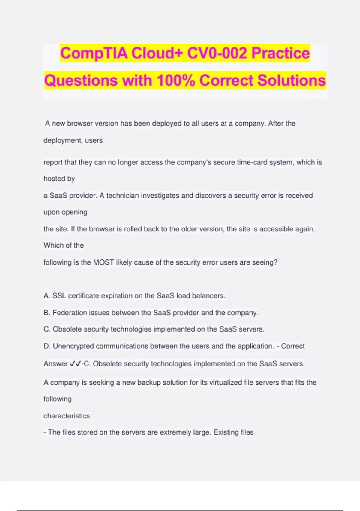 CompTIA Cloud+ CV0-002 Practice Questions with 100% Correct Solutions A new browser version has been deployed to all users at a company. After the deployment, users report that they can no longer access the company's secure time-card system, which is hosted by a SaaS provider. A technician investigates and discovers a security error is received upon opening the site. If the browser is rolled back to the older version, the site is accessible again. Which of the following is the MOST likely cause of the security error users are seeing? A. SSL certificate expiration on the SaaS load balancers. B. Federation issues between the SaaS provider and the company. C. Obsolete security technologies implemented on the SaaS servers. D. Unencrypted communications between the users and the application. - Correct Answer ️️ -C. Obsolete security technologies implemented on the SaaS servers. A company is seeking a new backup solution for its virtualized file servers that fits the following characteristics: - The files stored on the servers are extremely large. Existing files receive multiple small changes per day. - New files are only created once per month. - All backups are being sent to a cloud repository. Which of the following would BEST minimize backup size? A. Local snapshots B. Differential backups C. File-based replication D. Change block tracking - Correct Answer ️️ -B. Differential backups A courier company has virtualized its packing software application. The CSA needs to confirm the deployment is utilizing the correct amount of CPU per virtual instance. After confirming the deployment requirements, the CSA should log into the cloud services portal to ensure that ____. A. the VMs with the most CPU cores available have been selected B. smaller VMs are being selected to reduce the total deployment cost C. the deployment is utilizing the recommended amount of CPUs per VM D. the alarms on CPU utilization have been enabled - Correct Answer ️️ -C. the deployment is utilizing the recommended amount of CPUs per VM A cloud administrator is receiving alerts that the disk on several systems is 90% full. Upon reviewing the systems, the administrator determines that the log directory is using 50% of the disk. The company has a 14-day retention policy for all logs. Which of the following is the BEST solution to implement to minimize future alerts? A. Orchestrate a job to rotate the logs and upload to external storage. B. Delete any log files in the directory that are larger than 20MB. C. Archive the existing logs in the directory and upload to external storage. D. Add additional storage space to the log directory for the servers. - Correct Answer ️️ -A. Orchestrate a job to rotate the logs and upload to external storage. A company purchased a SaaS CRM application. The signed SLA meets year-round performance requirements. Three months after deployment, customers start reporting a slow application response time. System availability, connectivity, and proper functionality still meet the ... Which of the following is MOST likely the reason for the poor response time? A. Incorrect business requirements are invalidating the testing results. B. Bandwidth restrictions are causing poor performance. C. The application version is causing compatibility issues. D. Inadequate documentation is affecting the user interface. - Correct Answer ️️ -C. The application version is causing compatibility issues. A cloud architect created a new delivery controller for a large VM farm to scale up according to organizational needs. The old and new delivery controllers now form a cluster. However, the new delivery controller returns an error when entering the license code. Wh