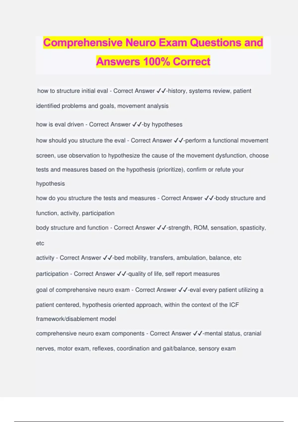 Comprehensive Neuro Exam Questions and Answers 100% Correct how to structure initial eval - Correct Answer ️️ -history, systems review, patient identified problems and goals, movement analysis how is eval driven - Correct Answer ️️ -by hypotheses how should you structure the eval - Correct Answer ️️ -perform a functional movement screen, use observation to hypothesize the cause of the movement dysfunction, choose tests and measures based on the hypothesis (prioritize), confirm or refute your hypothesis how do you structure the tests and measures - Correct Answer ️️ -body structure and function, activity, participation body structure and function - Correct Answer ️️ -strength, ROM, sensation, spasticity, etc activity - Correct Answer ️️ -bed mobility, transfers, ambulation, balance, etc participation - Correct Answer ️️ -quality of life, self report measures goal of comprehensive neuro exam - Correct Answer ️️ -eval every patient utilizing a patient centered, hypothesis oriented approach, within the context of the ICF framework/disablement model comprehensive neuro exam components - Correct Answer ️️ -mental status, cranial nerves, motor exam, reflexes, coordination and gait/balance, sensory exam