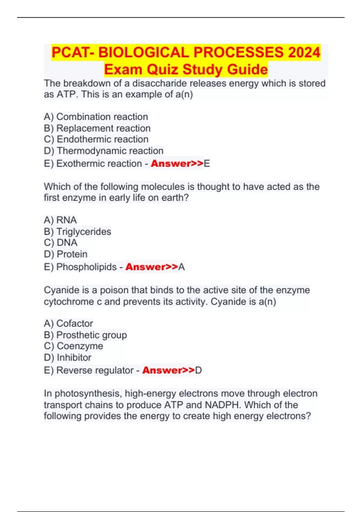 PCAT- BIOLOGICAL PROCESSES 2024 Exam Quiz Study Guide