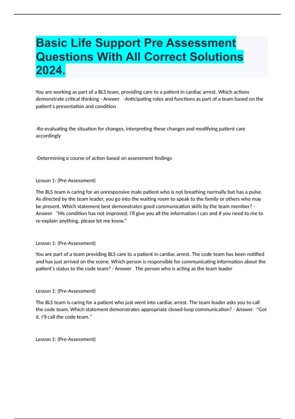 You are working as part of a BLS team, providing care to a patient in cardiac arrest. Which actions demonstrate critical thinking - Answer -Anticipating roles and functions as part of a team based on the patient's presentation and condition -Re-evaluating the situation for changes, interpreting these changes and modifying patient care accordingly -Determining a course of action based on assessment findings Lesson 1: (Pre-Assessment) The BLS team is caring for an unresponsive male patient who is not breathing normally but has a pulse. As directed by the team leader, you go into the waiting room to speak to the family or others who may be present. Which statement best demonstrates good communication skills by the team member? - Answer "His condition has not improved; I'll give you all the information I can and if you need to me to re-explain anything, please let me know." Lesson 1: (Pre-Assessment) You are part of a team providing BLS care to a patient in cardiac arrest. The code team has been notified and has just arrived on the scene. Which person is responsible for communicating information about the patient's status to the code team? - Answer The person who is acting as the team leader Lesson 1: (Pre-Assessment) The BLS team is caring for a patient who just went into cardiac arrest. The team leader asks you to call the code team. Which statement demonstrates appropriate closed-loop communication? - Answer "Got it. I'll call the code team." Lesson 1: (Pre-Assessment)