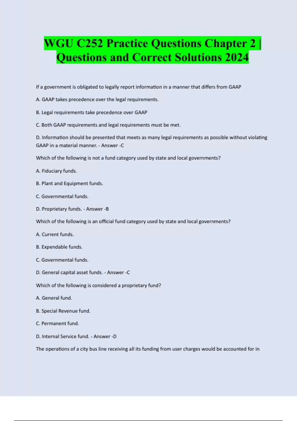 WGU C252 Practice Questions Chapter 2 | Questions and Correct Solutions 2024 If a government is obligated to legally report information in a manner that differs from GAAP A. GAAP takes precedence over the legal requirements. B. Legal requirements take precedence over GAAP C. Both GAAP requirements and legal requirements must be met. D. Information should be presented that meets as many legal requirements as possible without violating GAAP in a material manner. - Answer -C Which of the following is not a fund category used by state and local governments? A. Fiduciary funds. B. Plant and Equipment funds. C. Governmental funds. D. Proprietary funds. - Answer -B Which of the following is an official fund category used by state and local governments? A. Current funds. B. Expendable funds. C. Governmental funds. D. General capital asset funds. - Answer -C Which of the following is considered a proprietary fund? A. General fund. B. Special Revenue fund. C. Permanent fund. D. Internal Service fund. - Answer -D The operations of a city bus line receiving all its fundin