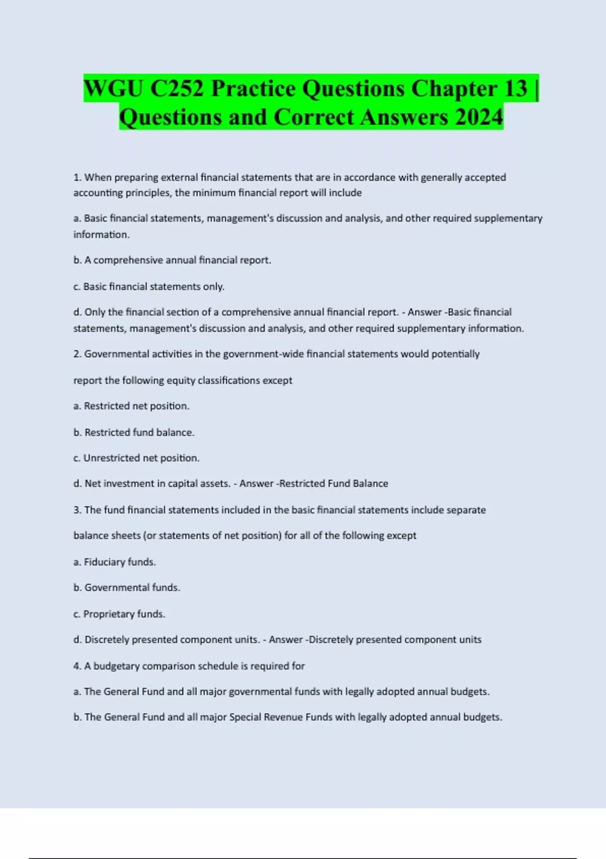 WGU C252 Practice Questions Chapter 13 | Questions and Correct Answers 2024 1. When preparing external financial statements that are in accordance with generally accepted accounting principles, the minimum financial report will include a. Basic financial statements, management's discussion and analysis, and other required supplementary information. b. A comprehensive annual financial report. c. Basic financial statements only. d. Only the financial section of a comprehensive annual financial report. - Answer -Basic financial statements, management's discussion and analysis, and other required supplementary information. 2. Governmental activities in the government-wide financial statements would potentially report the following equity classifications except a. Restricted net position. b. Restricted fund balance. c. Unrestricted net position. d. Net investment in capital assets. - Answer -Restricted Fund Balance 3. The fund financial statements included in the basic financial statements include separate balance sheets (or statements of net position) for all of the following except a. Fiduciary funds. b. Governmental funds. c. Proprietary funds. d. Discretely presented component units. - Answer -Discretely presented component units 4. A budgetary comparison schedule is required for a. The General Fund and all major governmental funds with legally adopted annual budgets. b. The General Fund and all major Special Revenue Funds with legally adopted annual budgets.c. The General Fund only. d. All governmental funds. - Answer -The General Fund and all major Special Revenue Funds with legally adopted annual budgets. 5. In the proprietary fund statements, a government should include a separate column for a. Each major Enterprise Fund only.