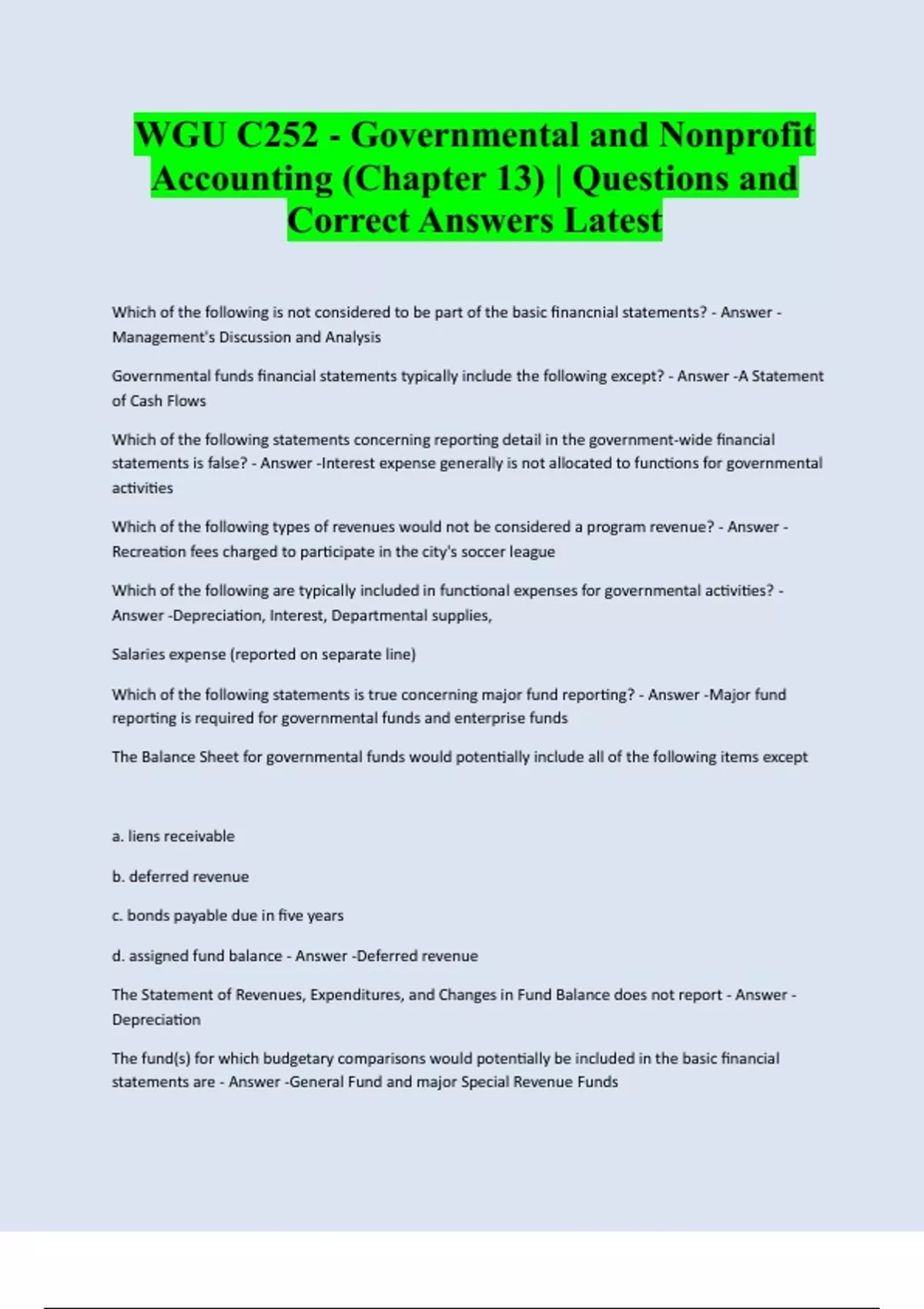 WGU C252 - Governmental and Nonprofit Accounting (Chapter 13) | Questions and Correct Answers Latest Which of the following is not considered to be part of the basic financnial statements? - Answer - Management's Discussion and Analysis Governmental funds financial statements typically include the following except? - Answer -A Statement of Cash Flows Which of the following statements concerning reporting detail in the government-wide financial statements is false? - Answer -Interest expense generally is not allocated to functions for governmental activities Which of the following types of revenues would not be considered a program revenue? - Answer - Recreation fees charged to participate in the city's soccer league Which of the following are typically included in functional expenses for governmental activities? - Answer -Depreciation, Interest, Departmental supplies, Salaries expense (reported on separate line) Which of the following statements is true concerning major fund reporting? - Answer -Major fund reporting is required for governmental funds and enterprise funds The Balance Sheet for governmental funds would potentially include all of the following items except a. liens receivable b. deferred revenue c. bonds payable due in five years d. assigned fund balance - Answer -Deferred revenue The Statement of Revenues, Expenditures, and Changes in Fund Balance does not report - Answer - Depreciation The fund(s) for which budgetary comparisons would potentially be included in the basic financial statements are - Answer -General Fund and major Special Revenu