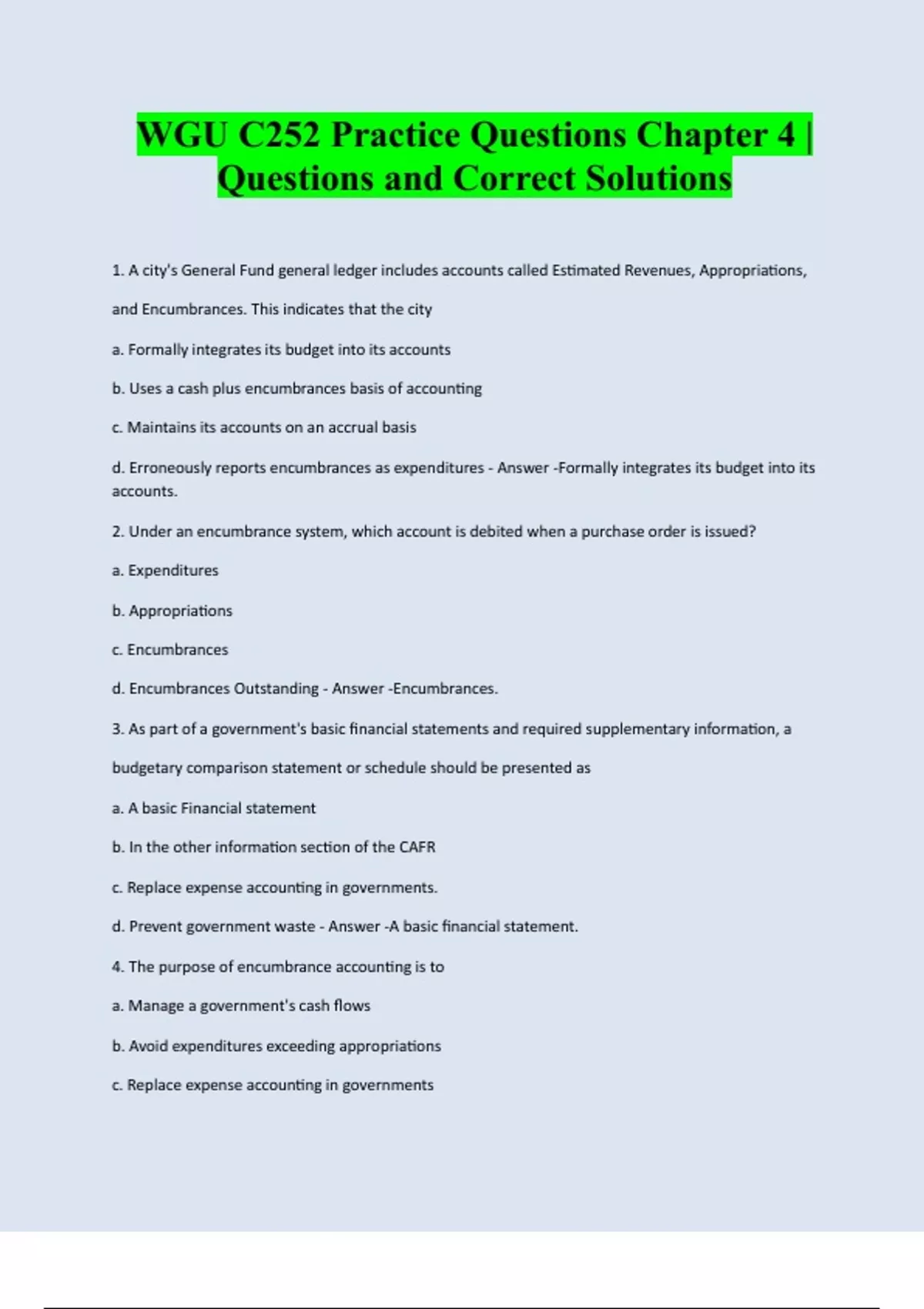 WGU C252 Practice Questions Chapter 4 | Questions and Correct Solutions 1. A city's General Fund general ledger includes accounts called Estimated Revenues, Appropriations, and Encumbrances. This indicates that the city a. Formally integrates its budget into its accounts b. Uses a cash plus encumbrances basis of accounting c. Maintains its accounts on an accrual basis d. Erroneously reports encumbrances as expenditures - Answer -Formally integrates its budget into its accounts. 2. Under an encumbrance system, which account is debited when a purchase order is issued? a. Expenditures b. Appropriations c. Encumbrances d. Encumbrances Outstanding - Answer -Encumbrances. 3. As part of a government's basic financial statements and required supplementary information, a budgetary comparison statement or schedule should be presented as a. A basic Financial statement b. In the other information section of the CAFR c. Replace expense accounting in governments. d. Prevent government waste - Answer -A basic financial statement. 4. The purpose of encumbrance accounting is to a. Manage a g