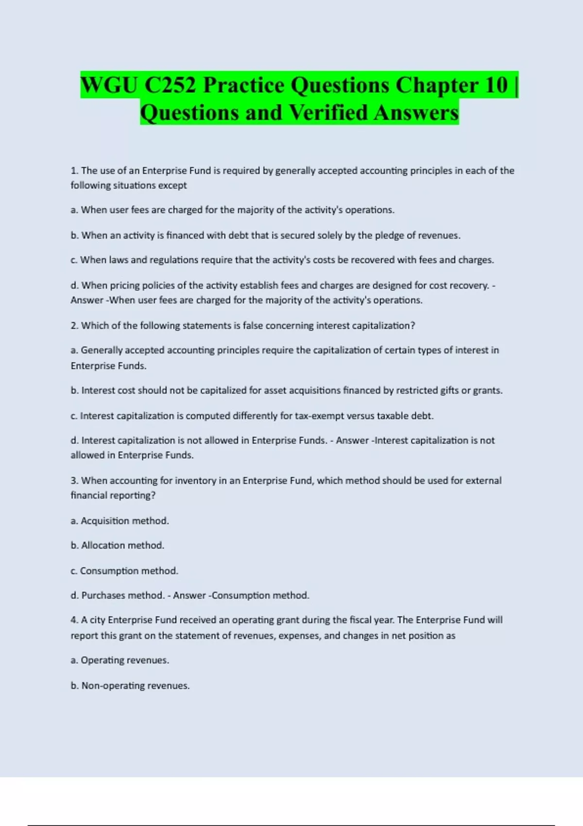 WGU C252 Practice Questions Chapter 10 | Questions and Verified Answers 1. The use of an Enterprise Fund is required by generally accepted accounting principles in each of the following situations except a. When user fees are charged for the majority of the activity's operations. b. When an activity is financed with debt that is secured solely by the pledge of revenues. c. When laws and regulations require that the activity's costs be recovered with fees and charges. d. When pricing policies of the activity establish fees and charges are designed for cost recovery. - Answer -When user fees are charged for the majority of the activity's operations. 2. Which of the following statements is false concerning interest capitalization? a. Generally accepted accounting principles require the capitalization of certain types of interest in Enterprise Funds. b. Interest cost should not be capitalized for asset acquisitions financed by restricted gifts or grants. c. Interest capitalization is computed differently for tax-exempt versus taxable debt. d. Interest capitalization is not allowed in Enterprise Funds. - Answer -Interest capitalization is not allowed in Enterprise Funds. 3. When accounting for inventory in an Enterprise Fund, which method should be used for external financial reporting? a. Acquisition method. b. Allocation method. c. Consumption method. d. Purchases method. - Answer -Consumption method. 4. A city Enterprise Fund received an operating grant during the fiscal year. The Enterprise Fund will report this grant on the statement of revenues, expenses, and changes in net position as a. Operating revenues.