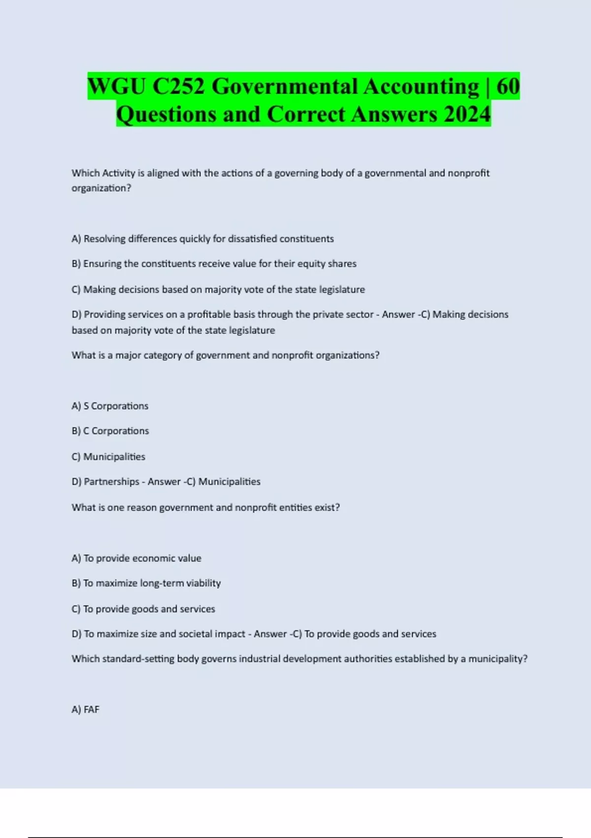 WGU C252 Governmental Accounting | 60 Questions and Correct Answers 2024 Which Activity is aligned with the actions of a governing body of a governmental and nonprofit organization? A) Resolving differences quickly for dissatisfied constituents B) Ensuring the constituents receive value for their equity shares C) Making decisions based on majority vote of the state legislature D) Providing services on a profitable basis through the private sector - Answer -C) Making decisions based on majority vote of the state legislature What is a major category of government and nonprofit organizations? A) S Corporations B) C Corporations C) Municipalities D) Partnerships - Answer -C) Municipalities What is one reason government and nonprofit entities exist? A) To provide economic value B) To maximize long-term viability C) To provide goods and services D) To maximize size and societal impact - Answer -C) To provide goods and services Which standard-setting body governs industrial development authorities established by a municipality? A) FAFB) FASB C) GASB D) NCGA - Answer -C) GASB Which entity is currently responsible for issuing standards for users of governmental financial reports? A) FAF B) FASB