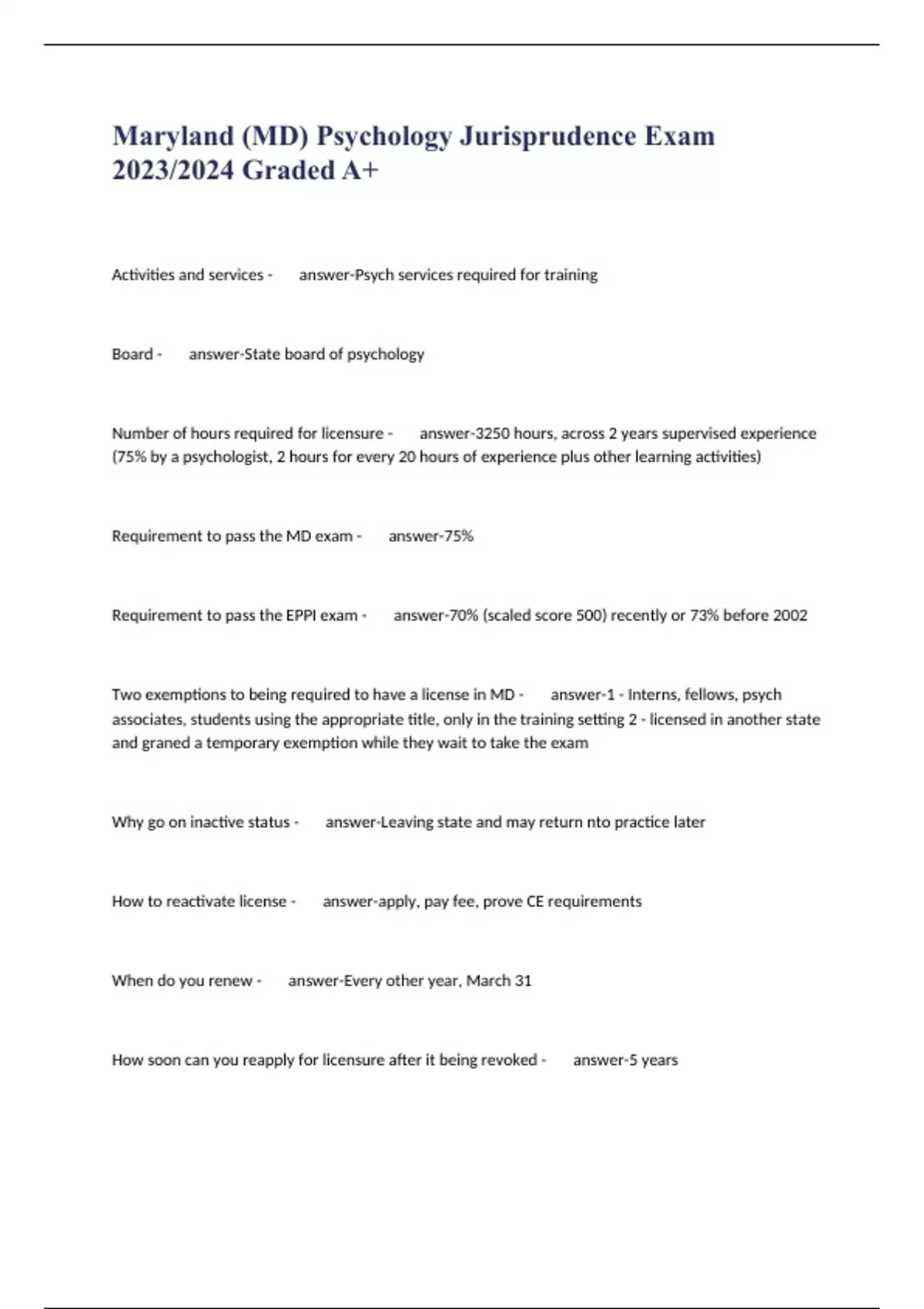 Activities and services - answer-Psych services required for training Board - answer-State board of psychology Number of hours required for licensure - answer-3250 hours, across 2 years supervised experience (75% by a psychologist, 2 hours for every 20 hours of experience plus other learning activities) Requirement to pass the MD exam - answer-75% Requirement to pass the EPPI exam - answer-70% (scaled score 500) recently or 73% before 2002 Two exemptions to being required to have a license in MD - answer-1 - Interns, fellows, psych associates, students using the appropriate title, only in the training setting 2 - licensed in another state and graned a temporary exemption while they wait to take the exam Why go on inactive status - answer-Leaving state and may return nto practice later How to reactivate license - answer-apply, pay fee, prove CE requirements When do you renew - answer-Every other year, March 31 How soon can you reapply for licensure after it being revoked - answer-5 years What is Board's mission - answer-ensure a minimum level of training is met