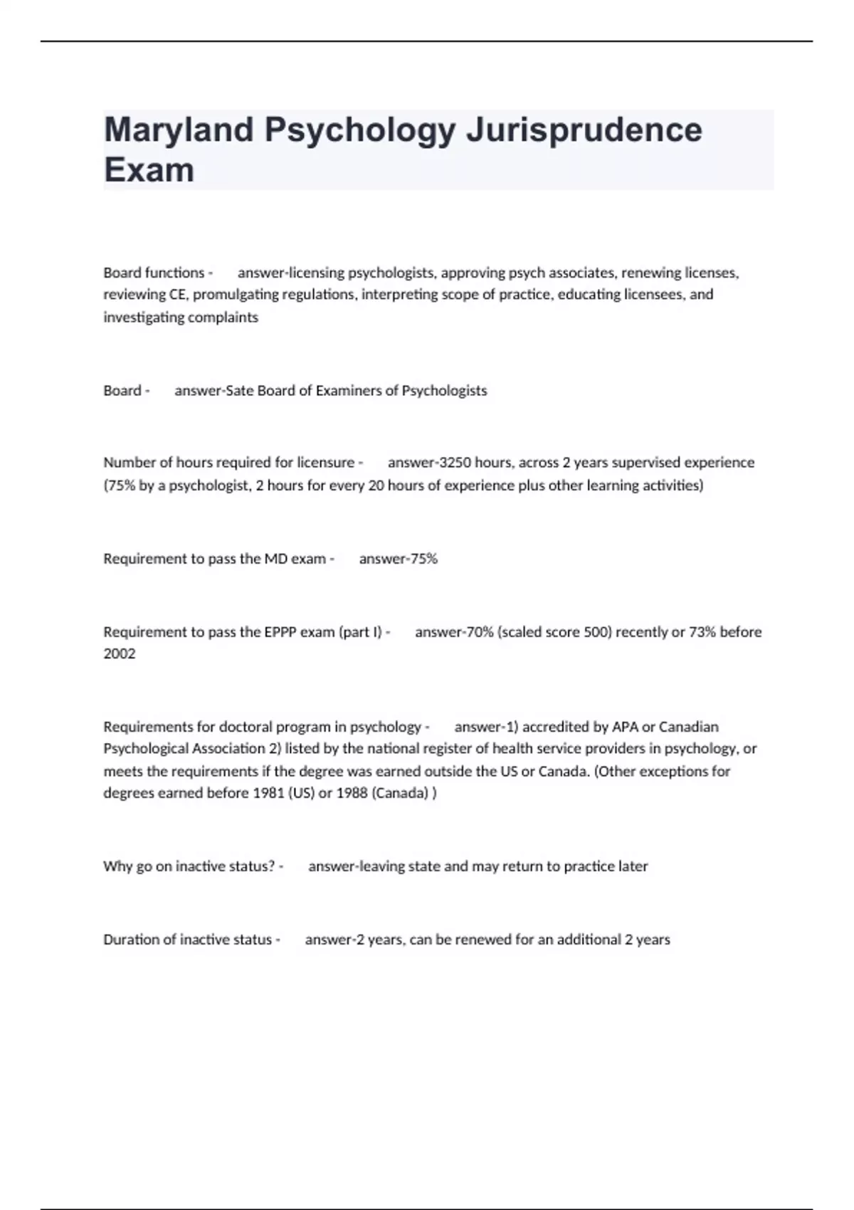 Board functions - answer-licensing psychologists, approving psych associates, renewing licenses, reviewing CE, promulgating regulations, interpreting scope of practice, educating licensees, and investigating complaints Board - answer-Sate Board of Examiners of Psychologists Number of hours required for licensure - answer-3250 hours, across 2 years supervised experience (75% by a psychologist, 2 hours for every 20 hours of experience plus other learning activities) Requirement to pass the MD exam - answer-75% Requirement to pass the EPPP exam (part I) - answer-70% (scaled score 500) recently or 73% before 2002 Requirements for doctoral program in psychology - answer-1) accredited by APA or Canadian Psychological Association 2) listed by the national register of health service providers in psychology, or meets the requirements if the degree was earned outside the US or Canada. (Other exceptions for degrees earned before 1981 (US) or 1988 (Canada) ) Why go on inactive status? - answer-leaving state and may return to practice later Duration of inactive status - answer-2 years, can be renewed for an additional 2 years