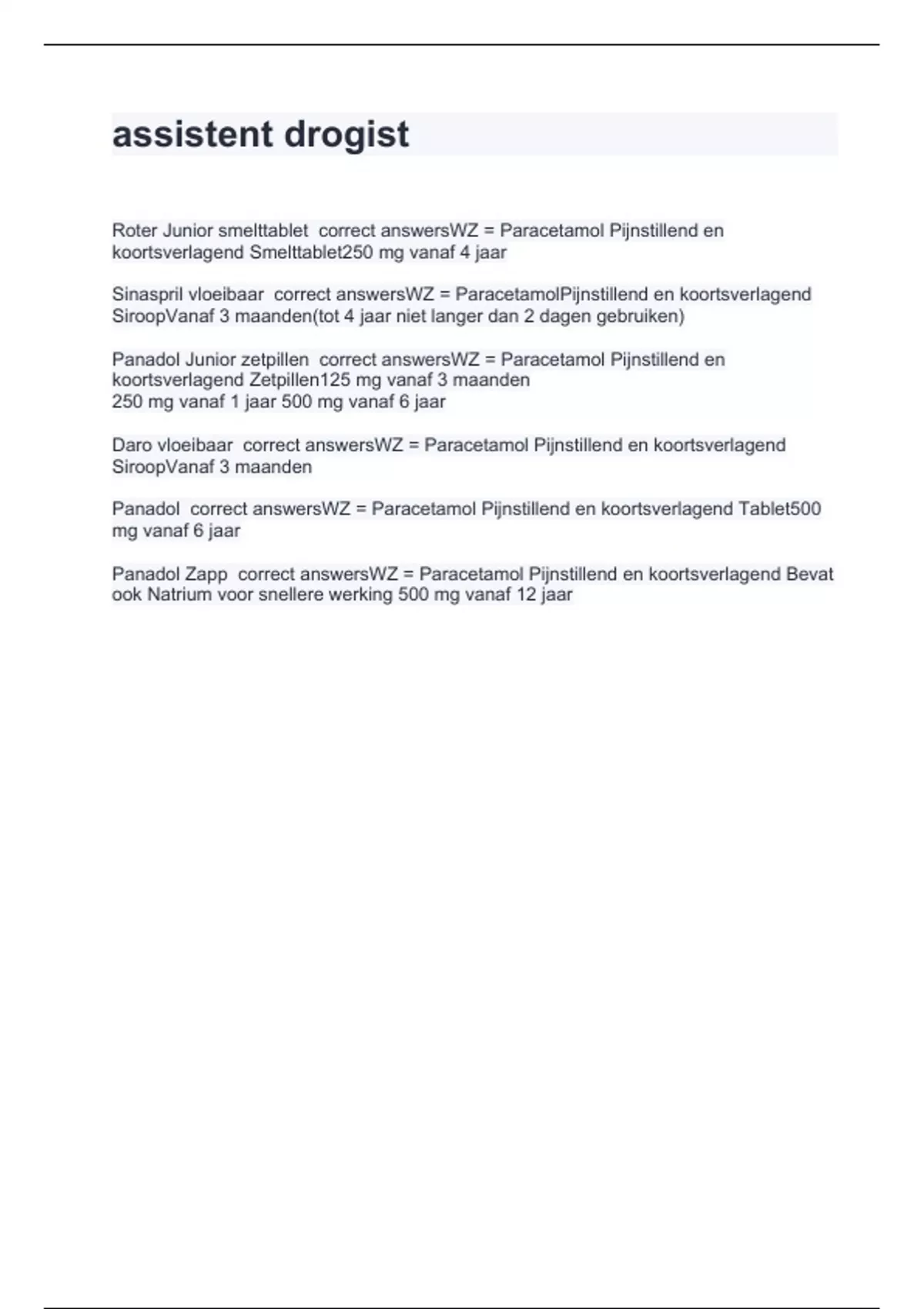 Roter Junior smelttablet correct answersWZ = Paracetamol Pijnstillend en koortsverlagend Smelttablet250 mg vanaf 4 jaar Sinaspril vloeibaar correct answersWZ = ParacetamolPijnstillend en koortsverlagend SiroopVanaf 3 maanden(tot 4 jaar niet langer dan 2 dagen gebruiken) Panadol Junior zetpillen correct answersWZ = Paracetamol Pijnstillend en koortsverlagend Zetpillen125 mg vanaf 3 maanden 250 mg vanaf 1 jaar 500 mg vanaf 6 jaar Daro vloeibaar correct answersWZ = Paracetamol Pijnstillend en koortsverlagend SiroopVanaf 3 maanden Panadol correct answersWZ = Paracetamol Pijnstillend en koortsverlagend Tablet500 mg vanaf 6 jaar Panadol Zapp correct answersWZ = Paracetamol Pijnstillend en koortsverlagend Bevat ook Natrium voor snellere werking 500 mg vanaf 12 jaar