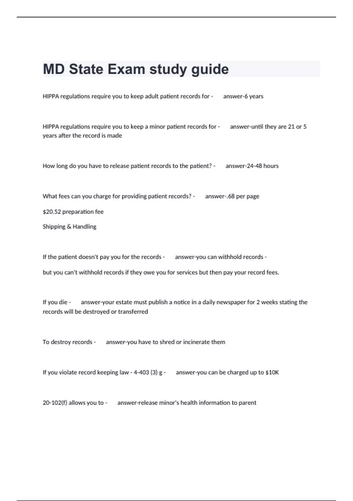 HIPPA regulations require you to keep adult patient records for - answer-6 years HIPPA regulations require you to keep a minor patient records for - answer-until they are 21 or 5 years after the record is made How long do you have to release patient records to the patient? - answer-24-48 hours What fees can you charge for providing patient records? - answer-.68 per page $20.52 preparation fee Shipping & Handling If the patient doesn't pay you for the records - answer-you can withhold records - but you can't withhold records if they owe you for services but then pay your record fees. If you die - answer-your estate must publish a notice in a daily newspaper for 2 weeks stating the records will be destroyed or transferred To destroy records - answer-you have to shred or incinerate them If you violate record keeping law - 4-403 (3) g - answer-you can be charged up to $10K 20-102(f) allows you to - answer-release minor's health information to parent